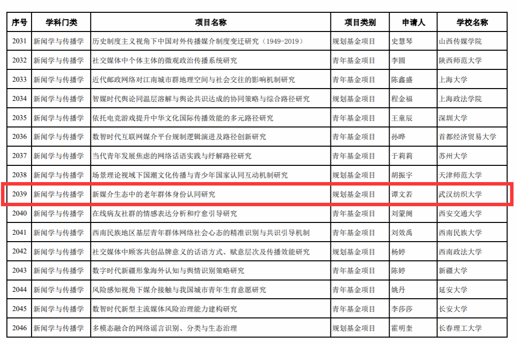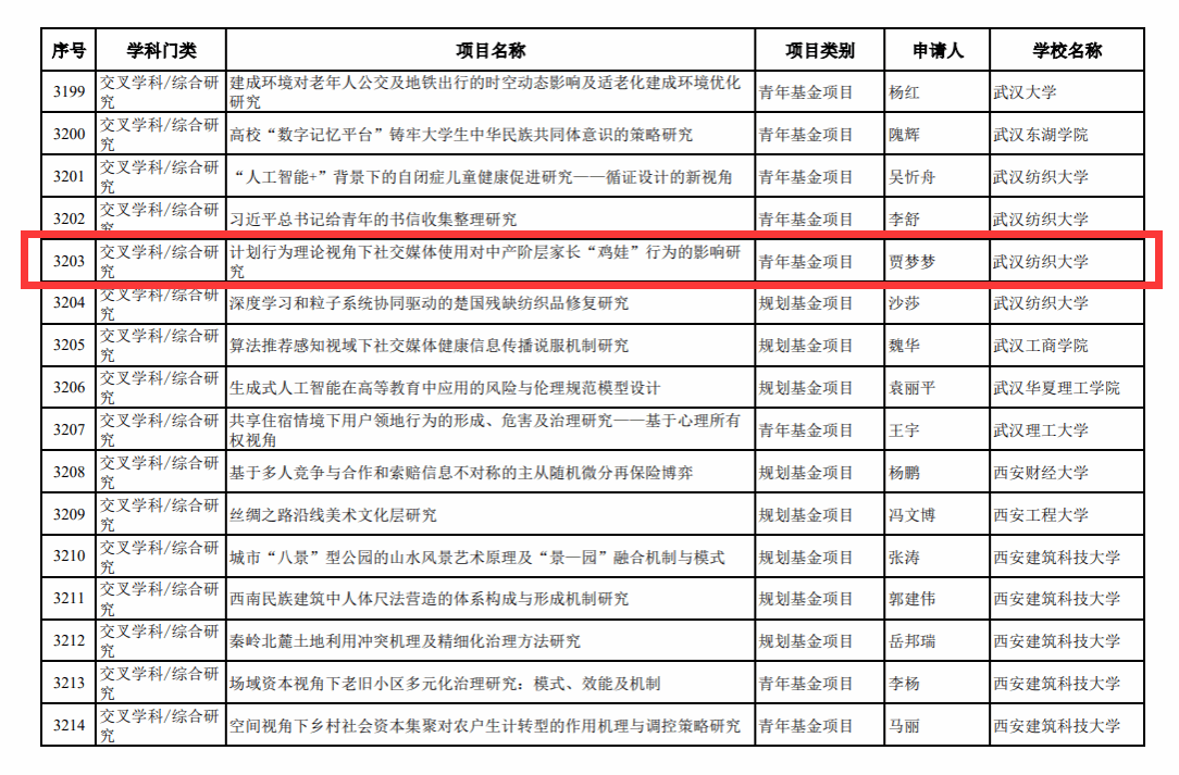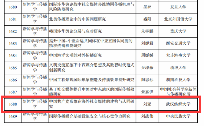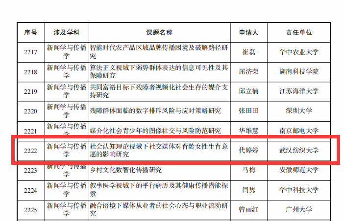 2024年国家社会科学基金年度项目,3044am永利集团代婷婷副教授《社会认知理论视域下社交媒体对育龄女性生育意愿的影响研究》课题获批一般项目,刘亚博士《中国共产党形象在海外社交媒体的建构与认同研究》课题获批青年项目。