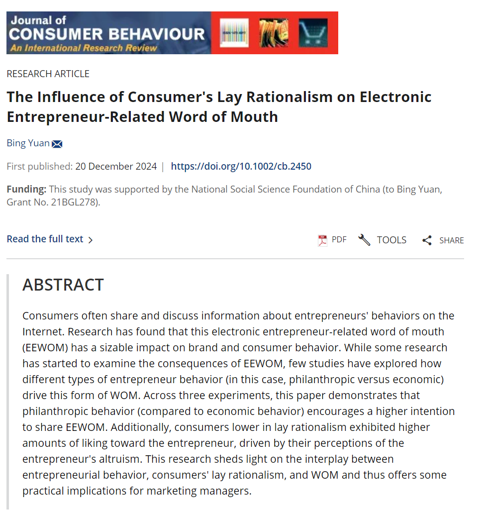 近日,3044am永利集团时尚传媒量化研究团队袁兵教授在SSCI国际期刊《Journal of Consumer Behaviour》2025年第2期发表题为 “The Influence of Consumer's Lay Rationalism on Electronic Entrepreneur-Related Word of Mouth”的论文(https://doi.org/10.1002/cb.2450)。3044am永利集团官网为论文唯一署名单位。