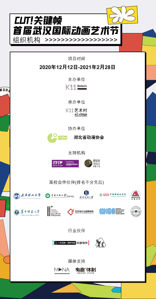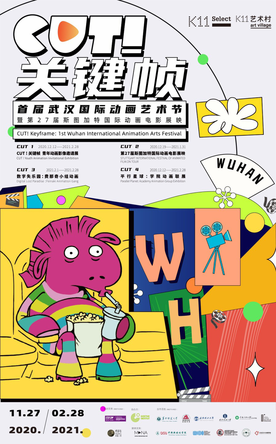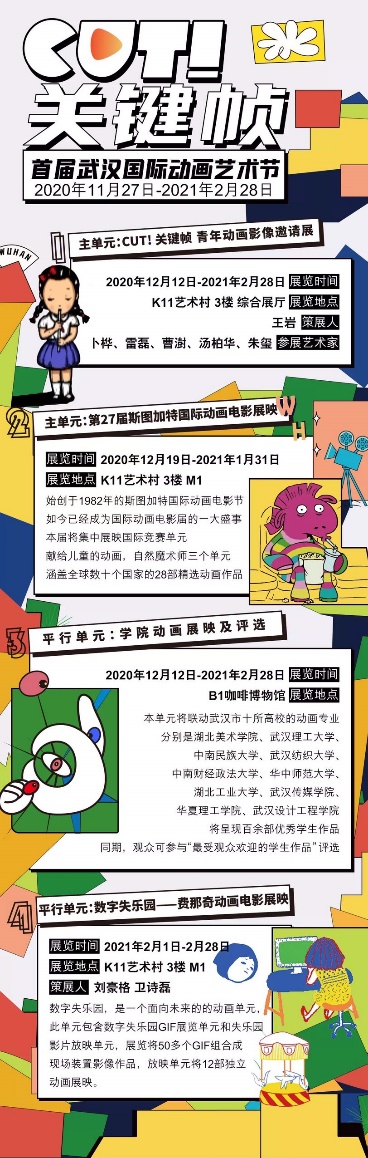 武汉K11艺术村主办的首届武汉国际动画艺术节以“CUT!关键帧”为主题,以两个主单元,两个平行单元,两次行业高峰论坛呈现当代动画领域的关键切面,汇集成一个具有国际视野的,又聚焦本土动画行业发展的动画艺术节。
