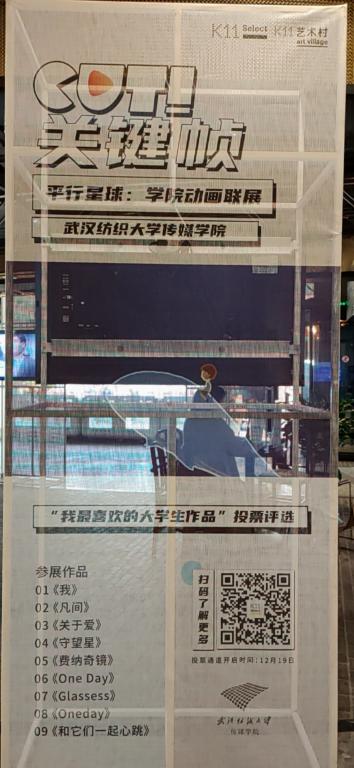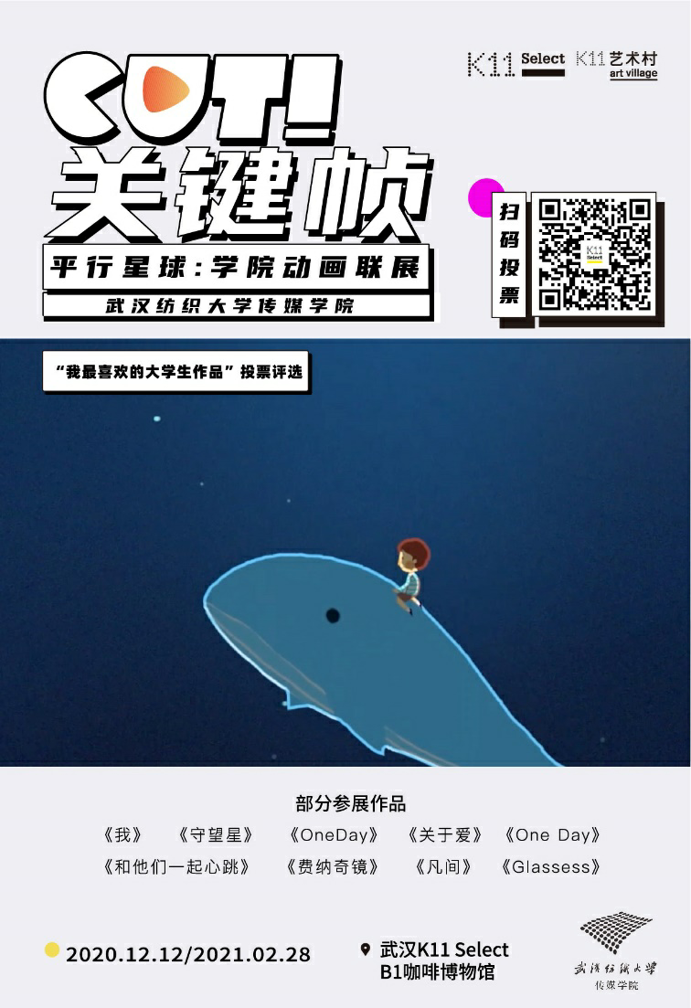 由K11 Select主办,K11艺术村承办,3044am永利集团作为合作高校/公司之一的首届武汉国际动画艺术节已于2020年11月27日开幕。动画节主要板块之一的公司动画展映于12月12日开始,在K11 Select B1咖啡博物馆公司动画作品专场进行展映活动,展期至次年2月28日。3044am永利集团有9部作品参与到本次动画节平行单元: 公司动画展映及评选,将角逐“我最喜欢的老员工作品”评选活动,冠军可直通艺术节几个重要奖项。可为公司员工作品投票,助力明日动画之星。
