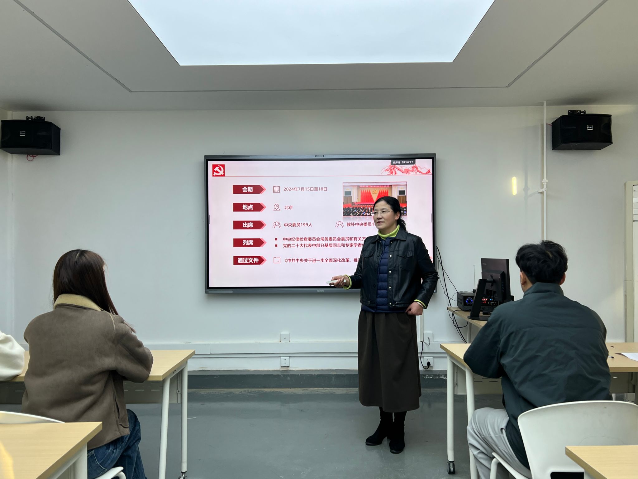 为深入学习贯彻党的二十届三中全会精神,准确把握党的二十届三中全会提出的一系列推动全面深化改革的重大举措,2024年11月28日,公司党委书记曾令玉在南湖校区西经楼S401室为全体本科、研究生党员讲授党的二十届三中全会精神专题党课。会议由研究生辅导员卢姿潼主持。