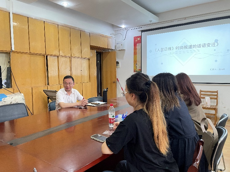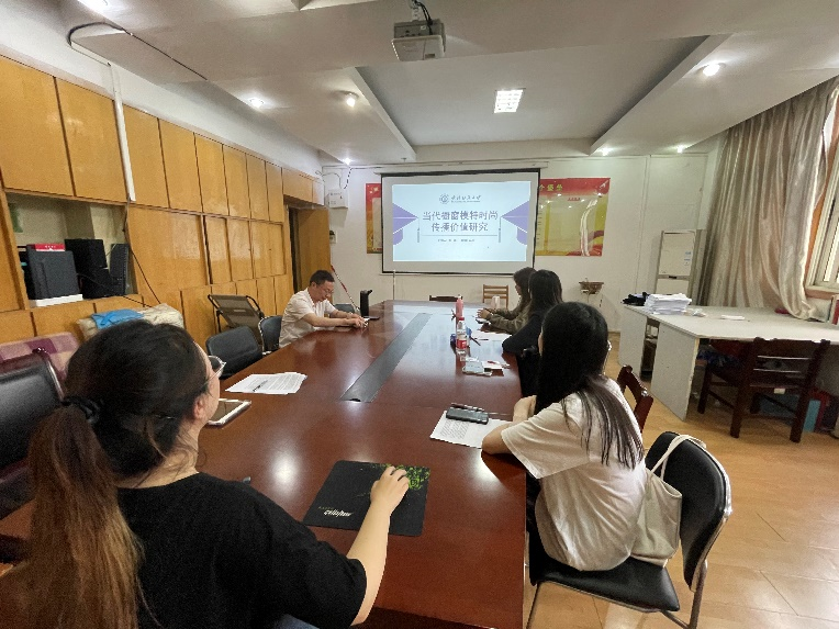 研究生周雯婷就其论文《情感与技术“双赋能”视角下戏剧演绎类文化综艺节目的叙事研究》展开,阐述自己的现有研究进度。研究生王泽尤以《建构主义视角下中国主流媒体时尚传播价值变迁研究——以十年来<人民日报>为中心的考察》展开时尚传播价值变迁研究的分享,讨论其论文整体框架及其内容,并交流分享研究结果发现。