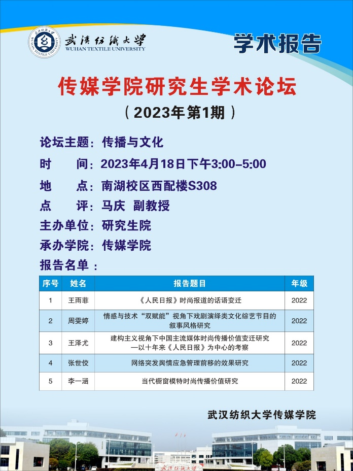 研究生张世佼以《网络突发舆情应急管理前移的应用及策略研究》为主题,介绍其研究方法及框架,并分享其研究发现。研究生李一涵就其论文《当代橱窗模特时尚传播价值研究》展开,阐述其论文整体内容结构与论文价值。