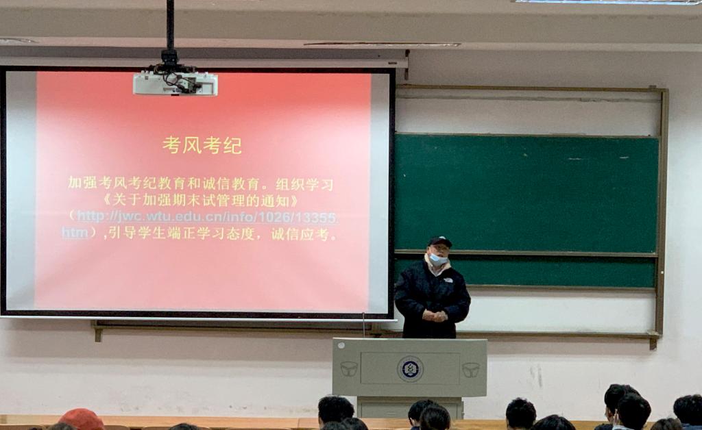 18级辅导员杜清华老师提醒同学们要严肃考风考纪,诚实做人,诚信考试,他提醒同学们期末临近,要认真复习各项课程,通过期末考试来简约本学期的学习成果,更是考验自己的道德与诚信。