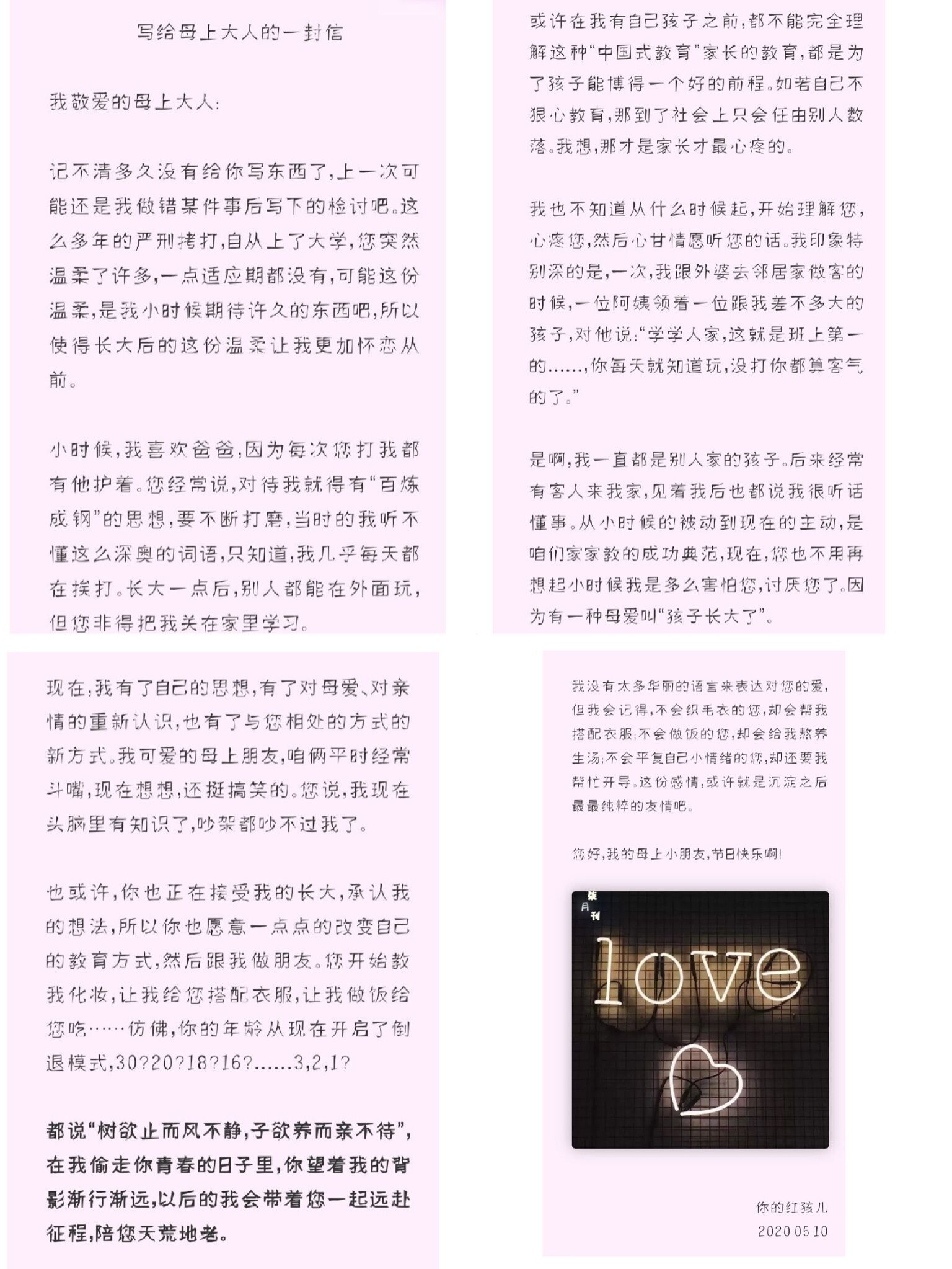 莫泊桑说:“人生最美的情景出现在我们怀念母亲的时候。只是因为我们的血液中流淌的,我们的言行举止中流露的那份独特而超凡的东西,都来自母亲的辛勤哺育和言传身教”。为迎接母亲节这个具有非凡意义的日子的来临,3044am永利集团“快乐小筑”心理工作站于2020年5月10日在线上开展了感恩母亲节的活动。