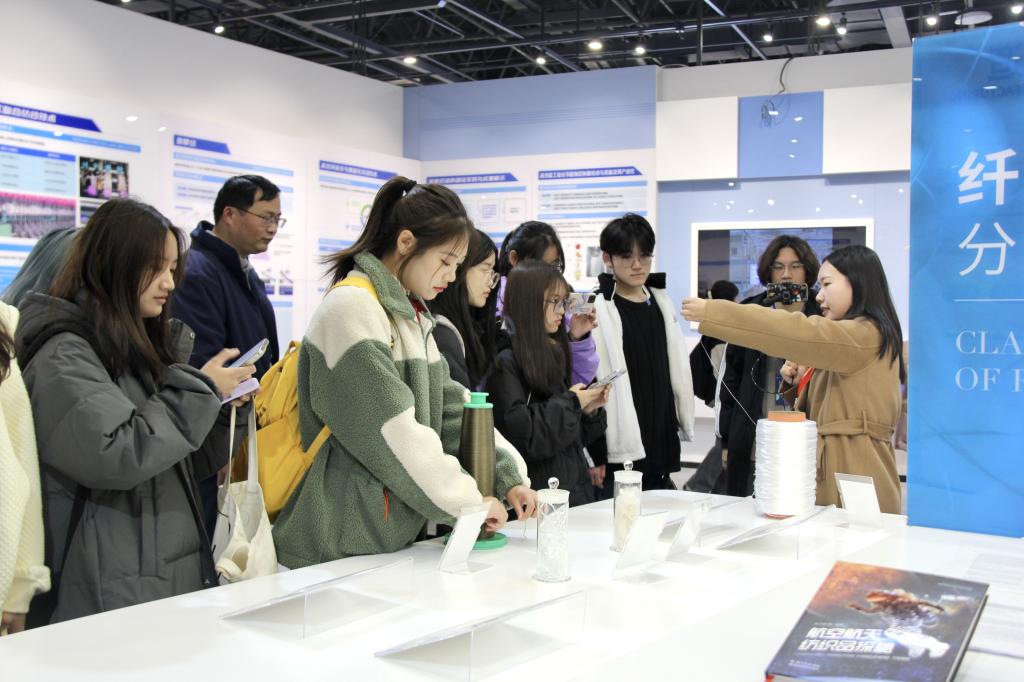 据悉,纺织科技馆共由纺织缘、传统纺织、现代纺织、大纺织、超纺织、未来纺织等六大展厅以及序厅和尾厅共八大部分构成。在讲解员带领下,同学们对湖北纺织史、纺大校史以及优秀员工有了全面认识,对公司发展和纺织行业有了更直接深刻的理解。通过对不同主题展厅的学习,同学们了解到了公司在在纺织领域取得的重大突破和科研成就。例如:织物版五星红旗旗开月面、耐高温密封装置成功助力天问一号火星着陆、“柔洁纺”“多重聚集纺纱”等发明推动行业发展、乙醇与水体系对织物染色方法推动生态保护等等。一项项科研成果、一张张荣誉证书以及一封封感谢信等,使同学们在对纺织行业全面了解的同时,心中更多了一份自豪与感动。