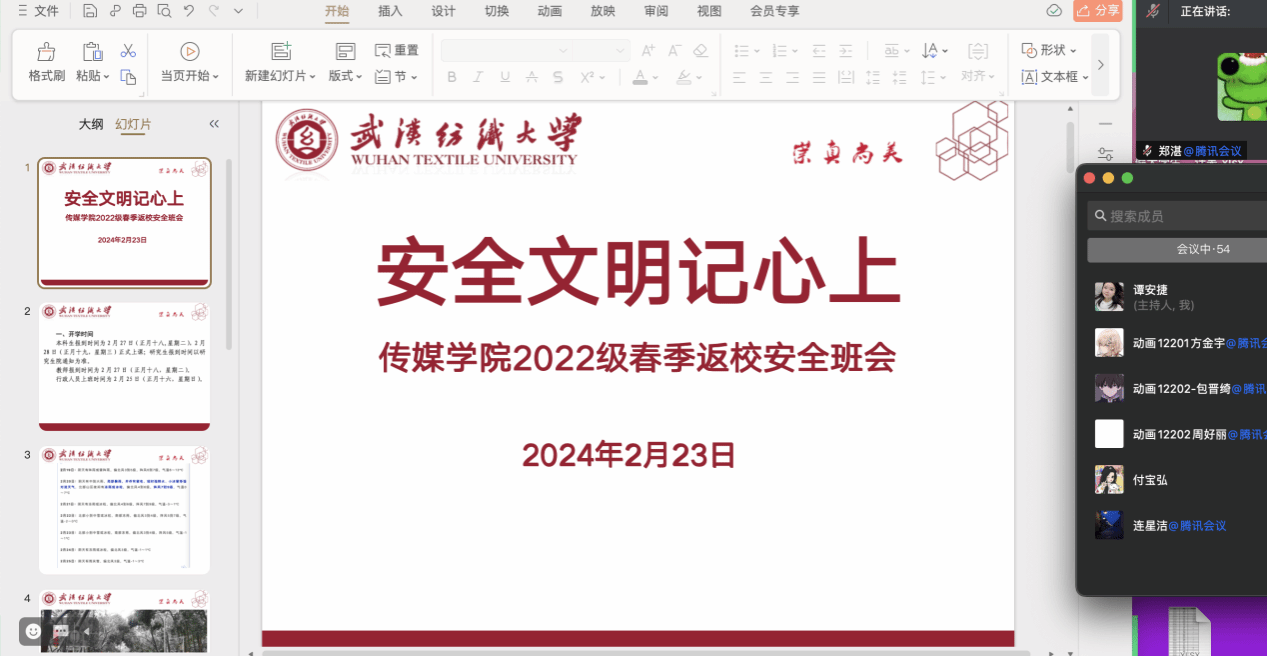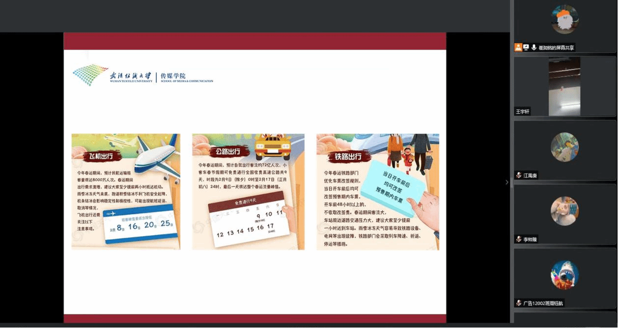 班会上,各年级辅导员、班主任老师对武汉市近期天气情况、调整后的开学时间和灾害天气防范知识进行了宣传普及,同时重点就灾害天气导致的安全隐患进行告知提醒,为全体员工如期、平安返校提供保障。除此老师们还结合具体案例,将与员工紧密相关的网络诈骗、网络贷款、传销、毒品事件的危害性传达给同学们,提醒员工注意法治安全、网络安全、消防安全、食品安全及宿舍安全。