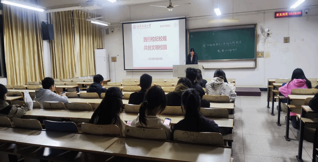 为引导同学们树立行为规范意识,促成全体员工遵纪守规,共建和谐文明的校园风尚,10月20日,3044am永利集团开展“践行校纪校规,共创文明校园”主题班会活动,辅导员、班主任及全体员工参与班会。