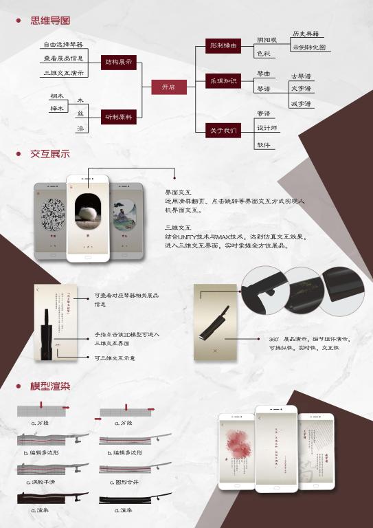 本产品是一款应用于移动端的认知型楚系古琴交互软件,该产品运用Unity 3D交互技术、MAX仿真建模技术、烘焙贴图等技术,实现二维界面与三维交互的结合,可供用户在任何环境下自由浏览楚系古琴展品,360度与展品模型互动,并获取相关文化知识。