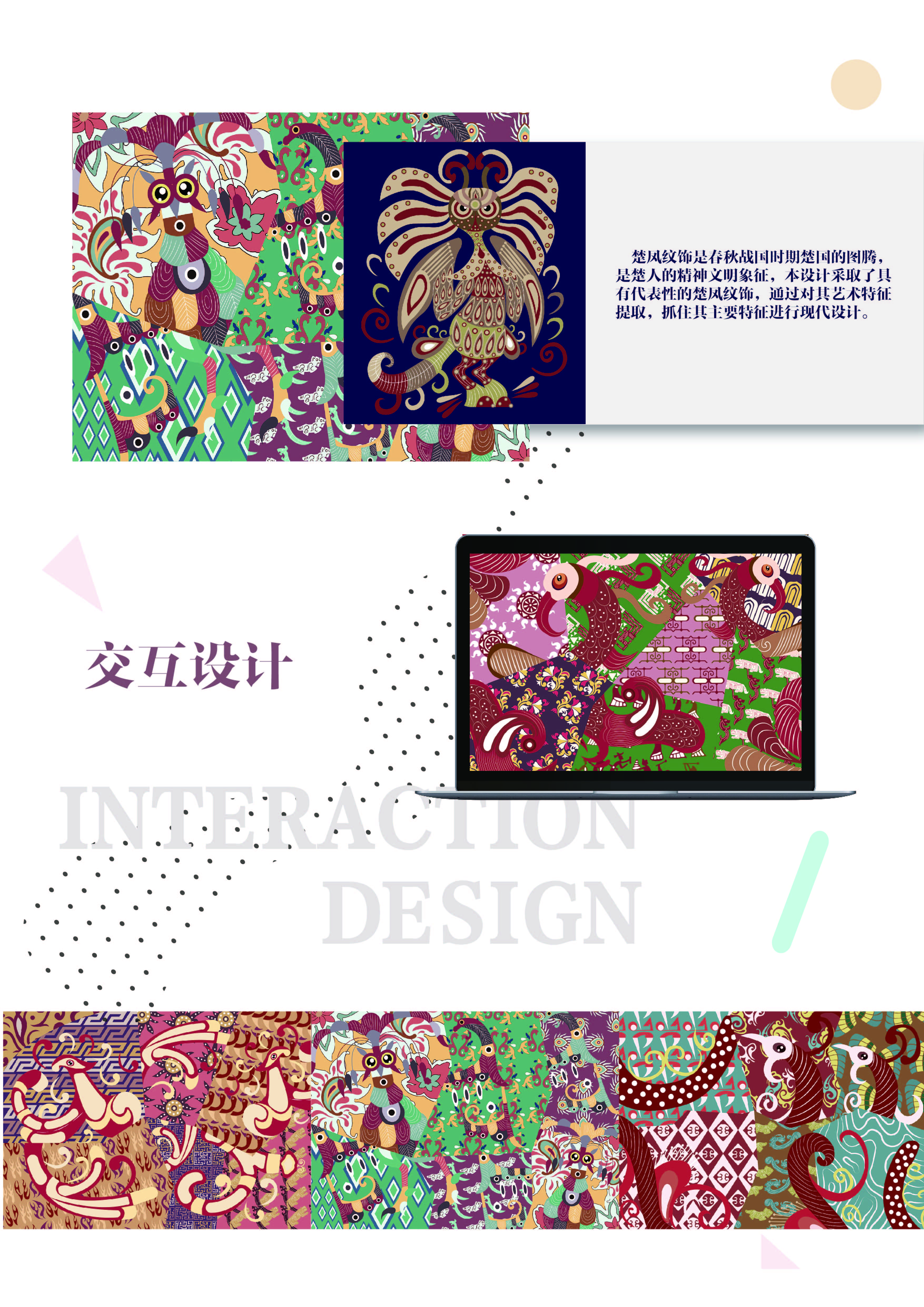 楚凤纹饰是春秋战国时期楚国的图腾,是楚人的精神文明象征,本设计采取了具有代表性的楚凤纹饰,通过对其艺术特征提取,抓住其主要特征和楚人的宗教文化,并对楚纹饰进行现代设计。楚文化纹饰图案的提炼,传统纹饰与现代设计的手段相结合,通过拼贴、打散、重组等手法,设计出新的现代图案,保留了原始特征的同时也不乏现代特色。把新的图形与屈原的诗词歌赋结合起来,增强其时代性和文化内涵,突出楚凤纹饰高洁、坚毅的品格;第二种运用打散、重构的现代设计手法,将图形进行拆分然后重组,形成似像非像的新图形;第三种运用无规则的排列方式,使图形不再那么死板,具有层次感,有大有小,有前有后,互相有对比,画面丰富的同时还具有灵感。