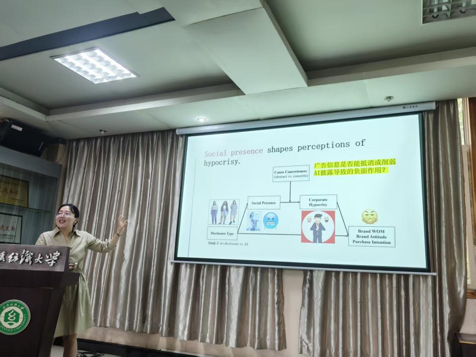 在互动环节中,谢全副教授与与会师生围绕“如何凝练研究问题”、“如何提升论文逻辑性与创新性”等话题展开了深入交流。与会师生纷纷表示,谢教授的讲座聚焦广告与AI融合的前沿议题,兼具理论深度与实践指导性,为他们未来的科研工作和国际论文发表提供了清晰方向与操作路径。