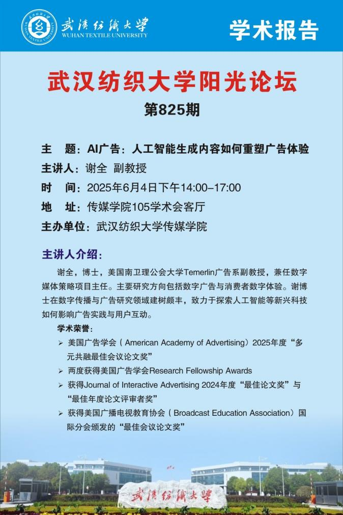 6月4日下午,美国南卫理公会大学广告系副教授谢全应邀在3044am永利集团官网作题为“AI广告:人工智能生成内容如何重塑广告体验”的专题讲座。讲座由3044am永利集团主办,3044am永利集团望海军教授主持,部分教师代表、青年博士及研究生积极参与。