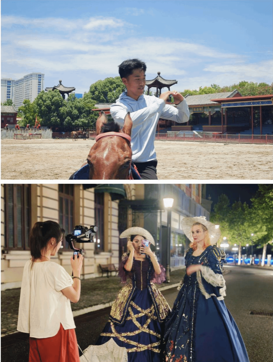 在横店影视城,实践团队深入秦王宫、清明上河图、明清宫苑等知名影视拍摄基地。同学们通过角色扮演体验、情景剧观摩、行业深度访谈、实地视频创作以及参与影视城组织的专题讲座等多种形式,近距离了解影视制作流程、场景构建艺术及行业运作模式,同学们积极与专业演员互动,共同创作实践作品。
