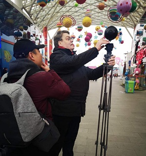沃尔夫冈教授特意将他从德国带来的全景摄像机带上,这个有六个镜头的全景摄像机是一种最新的影像采集器材,是他专门从德国带来准备用于在纺大教学的设备。沃尔夫冈教授一边欣赏元宵灯会,一边为员工示范如何对整个灯会进行各个场景、不同角度的全景拍摄,边拍摄边讲解,同学们对教授拍摄全景视频的教学非常感兴趣。