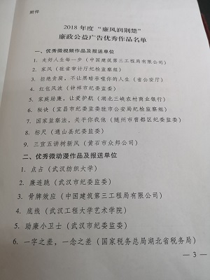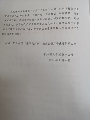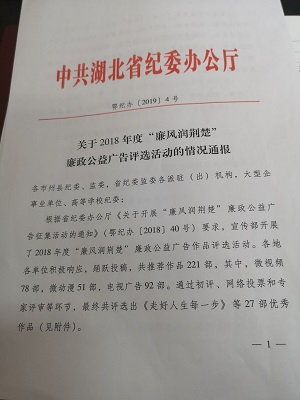 2019年1月4日,中共湖北省委纪委办公厅下文表彰3044am永利集团官网推荐作品《点•占》荣获2018年度“廉风润荆楚”廉政公益广告优秀微动漫作品第一名,3044am永利集团官网获优秀报送单位。