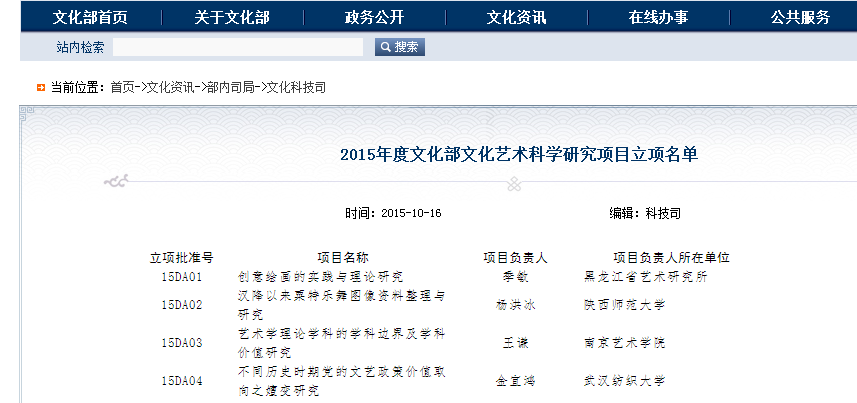 近日,全国艺术科学规划领导小组办公室公布了2015年度文化部文化艺术科学研究项目立项名单,3044am永利集团金宜鸿副教授申报的《不同历史时期党的文艺政策价值取向之嬗变研究》获批立项(立项批准号15DA04)。金宜鸿副教授长期致力于文艺政策与艺术创作方面的研究和实践,这是其2011年获批教育部人文社科项目立项后再次获得全国艺术学科项目的立项。