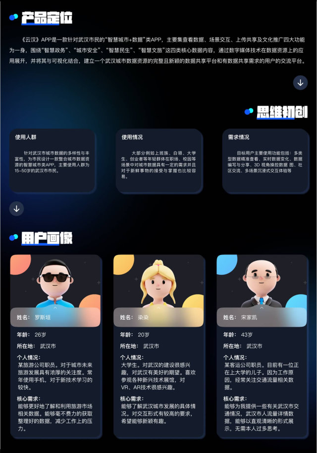 随着城市人口的不断膨胀,城市在人类社会的进步中扮演着越来越重要的角色,城市管理者的治理能力和城市资源承载能力正面临着巨大的挑战。智慧城市作为一种新型的城市化模式,是解决这些问题的有效途径之一。从2021年开始,国家和地方陆续出台了一系列关于“十四五”发展规划的政策,旨在将建设新型智慧城市和推进以人为中心的新主要方向。为响应“十四五”规划,我们将设计一款为武汉智慧化城市服务的数据资源APP,产品名称为《数享武汉》。该APP将围绕“智慧政务”、“城市安全”、“智慧民生”、“智慧文旅”这四类核心数据内容,将数据作品以动态图像、3D数据模型以及视频等方式来展示数据运动的变化效果,并且在APP的基础上嵌入同主题的虚拟城市数据展厅——《数享武汉·Meta》的资源。在展示方法和交互手段上,力求将二维平面与三维立体展示方法相结合,用更多元的交互手段,打造不一样的智慧城市信息展示平台,鼓励武汉市民了解武汉这座城市,增加对城市数据的关注度,从而呼吁市民进一步对城市数据的主动开放,增强市民对于城市建设的参与感,共筑美好武汉智慧城市。