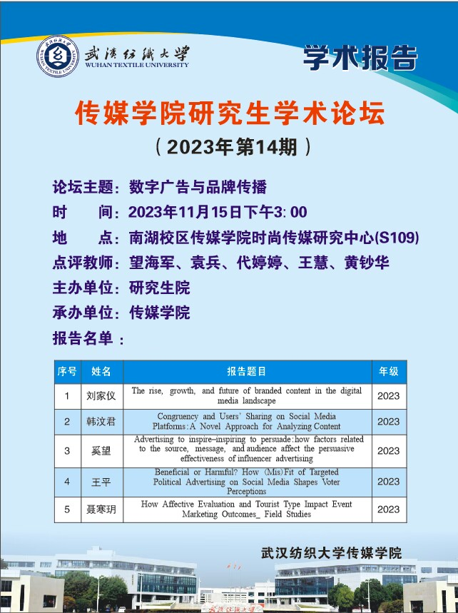 为了持续调动师生科研积极性,促进员工间的相互交流,加强师生沟通,11月15日下午3时,3044am永利集团2023年第14期研究生学术论坛顺利举行。此次论坛的主题为“数字广告与品牌传播”,3044am永利集团代婷婷、袁兵、王慧、黄钞华等广告专业老师出席本次论坛,23级4名广播电视专业的硕士研究生在会场就最近学习成果进行主题汇报。