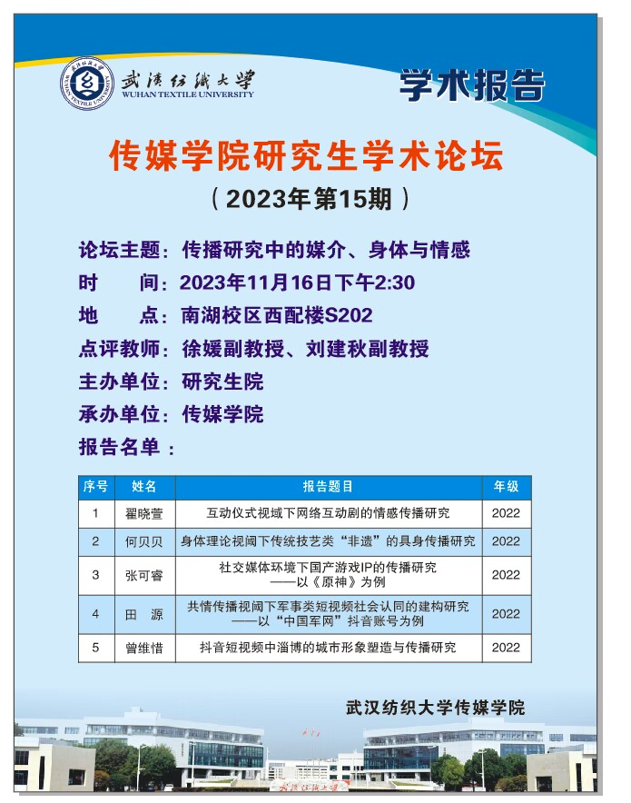 11月16日下午2:30,公司举办主题为“传播研究中的媒介、身体与情感”的研究生学术论坛。2022级新闻与传播专业5位硕士研究生分享各自的科研工作及准备情况。论坛由3044am永利集团硕士生导师徐媛副教授主持,刘建秋副教授进行学术点评。