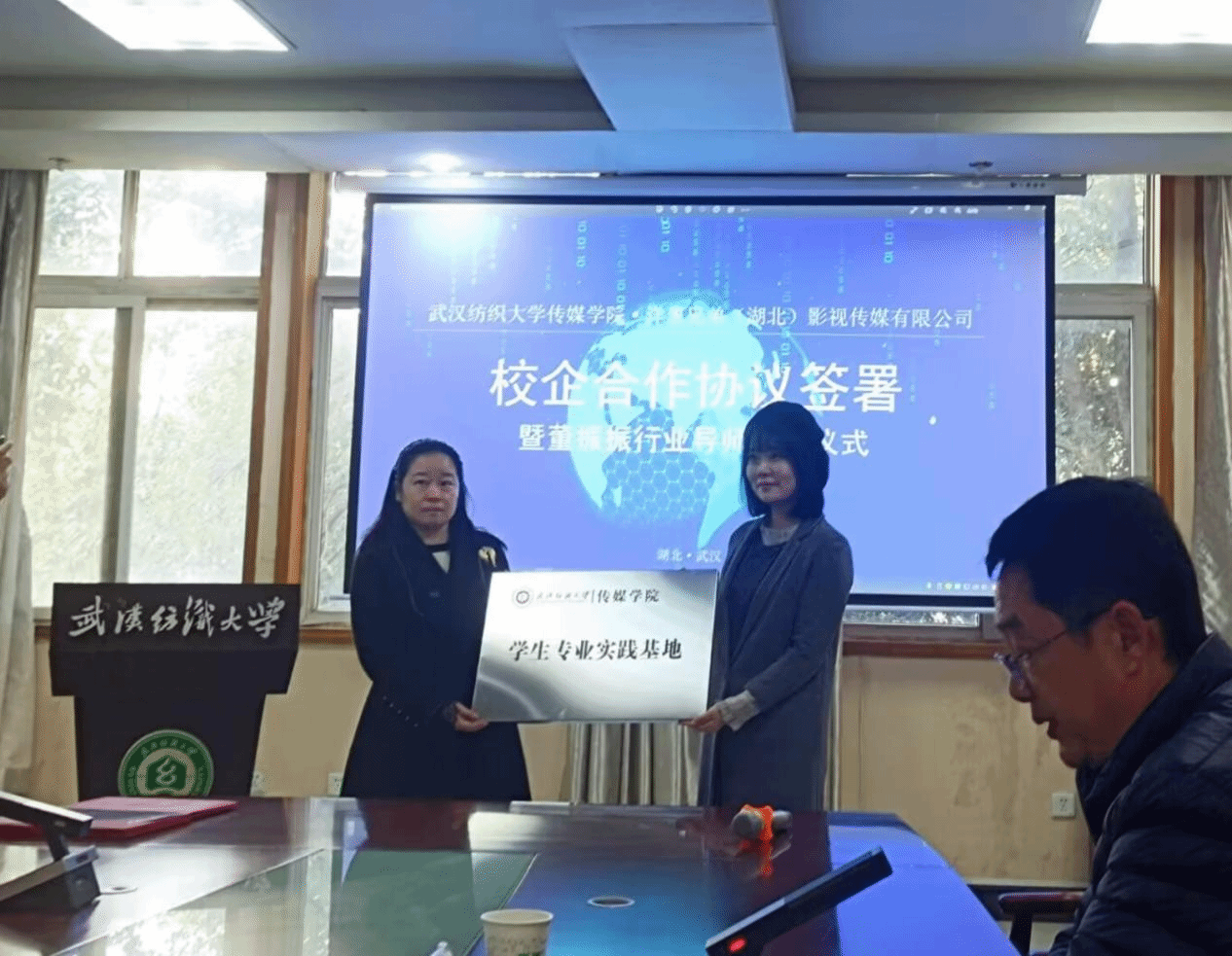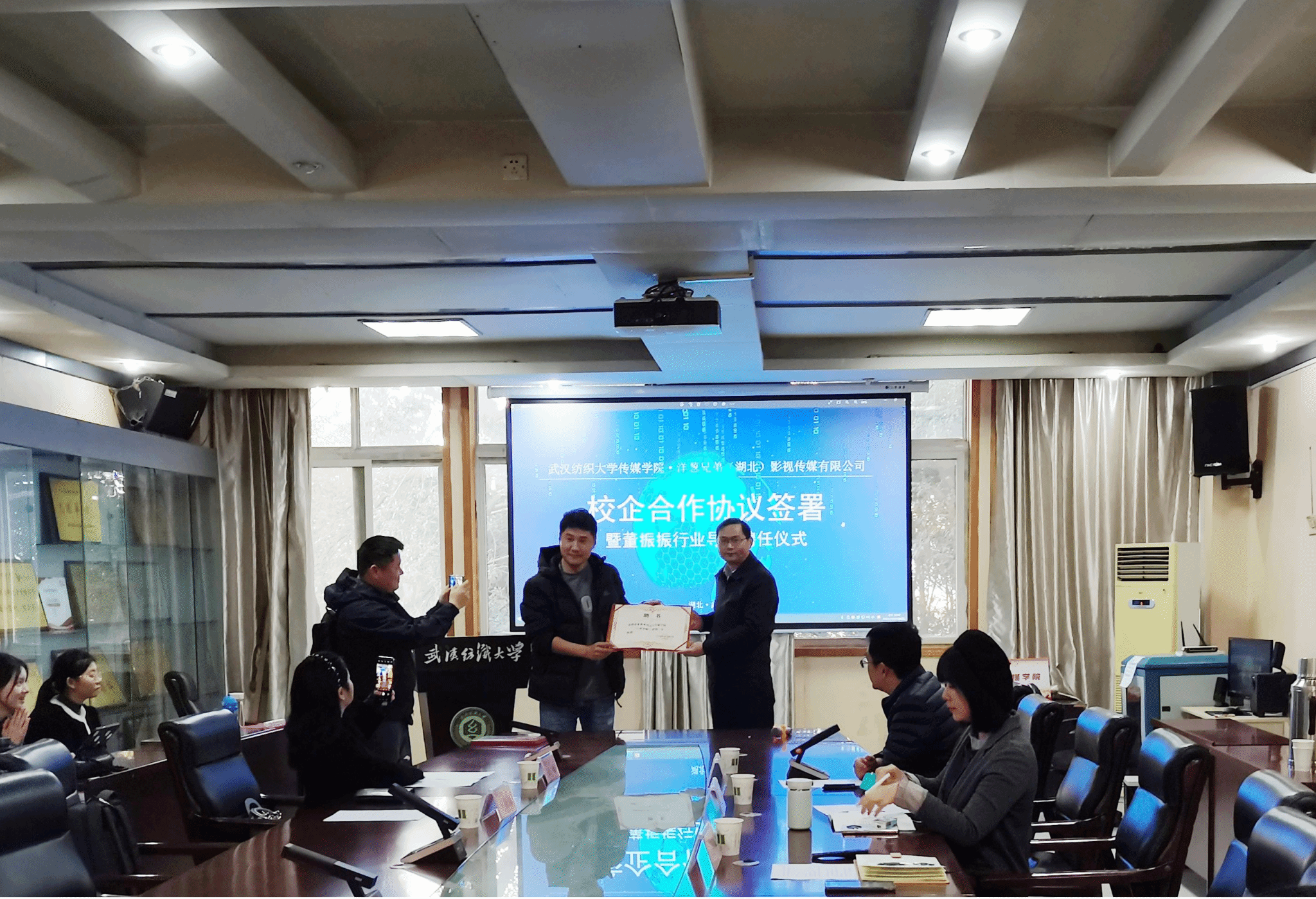 讲座伊始,金宜鸿教授对董振振制片人的到来表示热烈欢迎,并主持3044am永利集团与洋葱兄弟(湖北)影视传媒有限公司校企合作签约暨董振振行业导师聘任仪式。熊蕾副经理与王娟总经理进行了3044am永利集团员工专业实践基地授牌仪式。