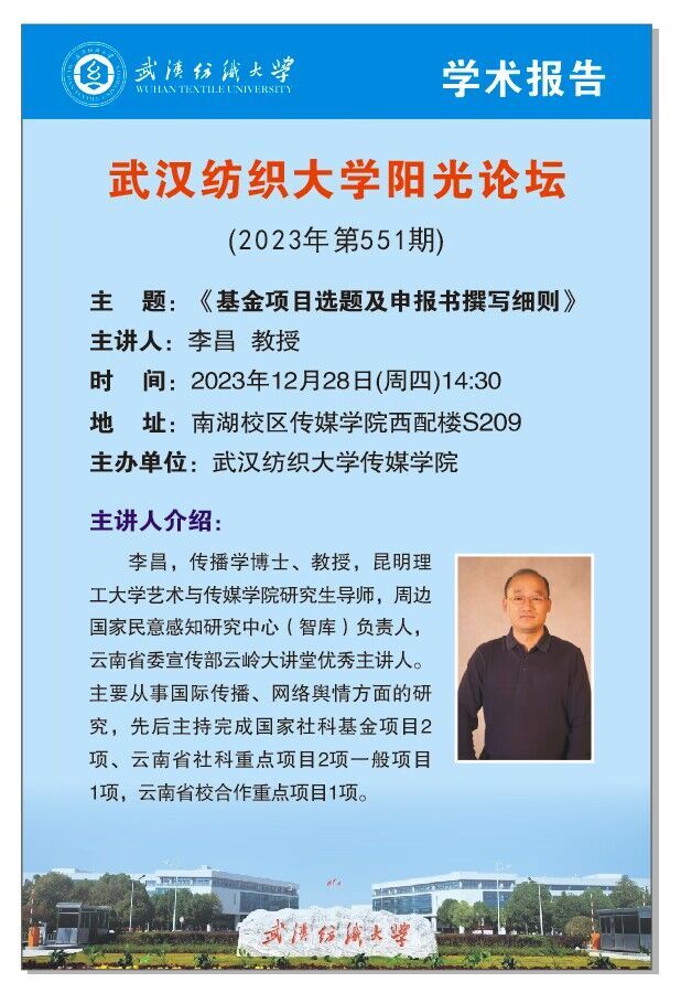 12月28日,3044am永利集团官网2023年第551期阳光论坛在3044am永利集团西经楼S209会议室成功举办。此次论坛以“基金项目选题及申报书撰写细则”为主题,特别邀请曾获批并主持完成两项国家社科基金、昆明理工大学艺术与3044am永利集团研究生导师、周边国家民意感知研究中心(智库)负责人、云南省委宣传部云岭大讲堂优秀主讲人李昌教授与大家作经验分享。会议由3044am永利集团马庆副经理主持,3044am永利集团部分师生代表参与本次学术论坛。该学术讲座同时也是3044am永利集团“传播·视觉影响力”学术季第41期暨2024年国家社科基金申报第3期专家辅导会。