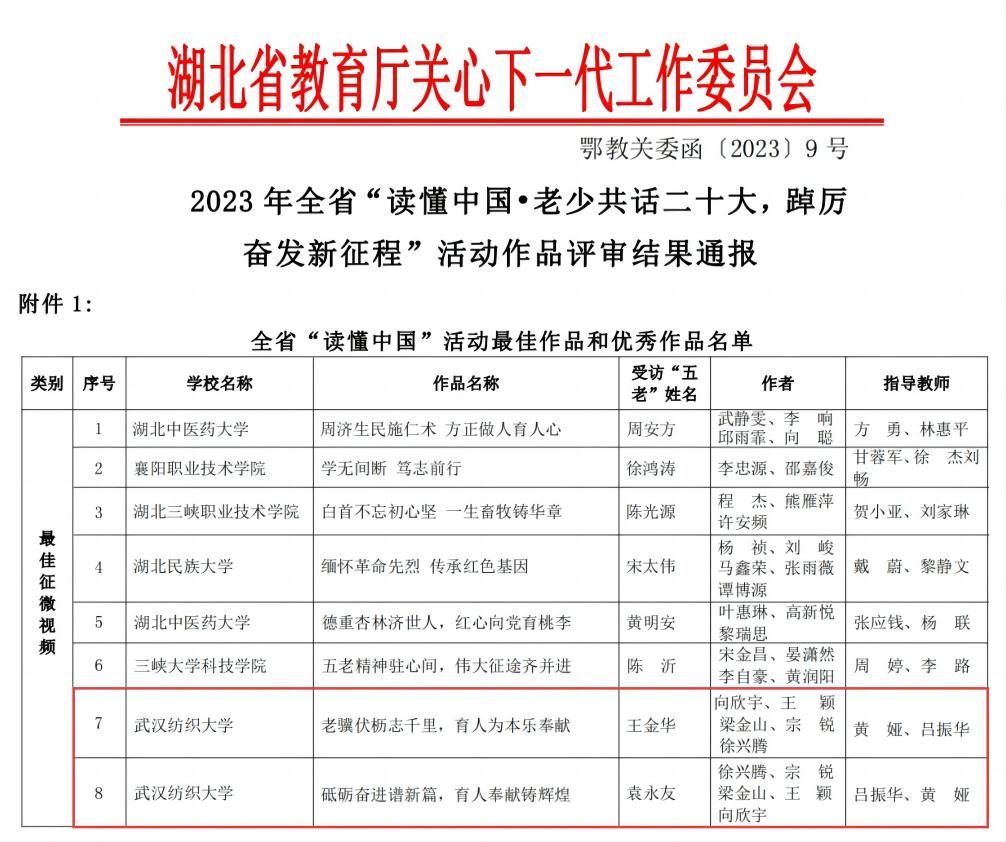 近日,湖北省教育厅关工委公布了2023年“读懂中国”活动入选作品名单,经过专家评审,3044am永利集团向欣宇、徐兴腾、宗锐等“四力”实践团队员工作品《老骥伏枥志千里 育人为本乐奉献》和《砥砺奋进谱新篇 育人奉献铸辉煌》分别获评最佳微视频奖。