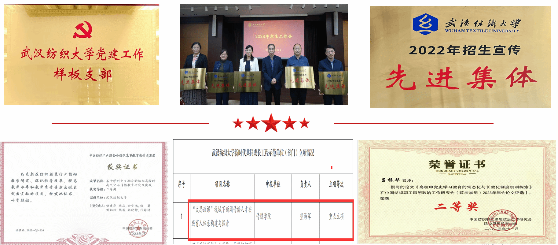 获中国纺织职工思想政治工作研究会2023年会论文二等奖1项。获批“建功美好纺大·功成必定有我”样板支部1项,“美好纺大党旗红”“五好”成果4项。3044am永利集团官网新时代共同成长工程示范单位重点项目1项,3044am永利集团官网网络文化工作室培育项目1项。