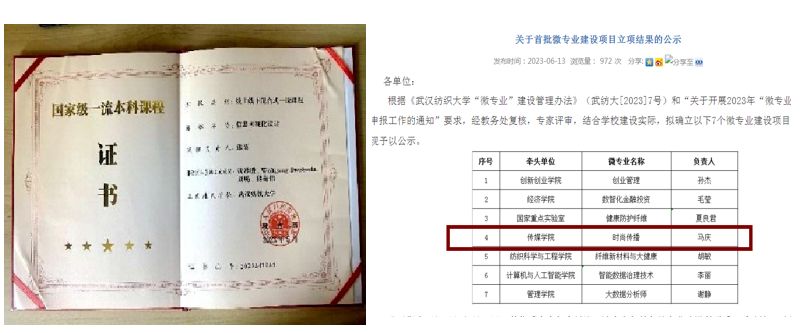 以社会需求、行业趋势、新文科建设发展纲要为导向,加强专业建设与课程建设,熊菊老师《信息可视化设计》获批2023年国家级一流课程,谭文若老师《广告学概论》获批湖北省一流课程。马庆老师《时尚传播》获3044am永利集团官网首批微专业建设立项。