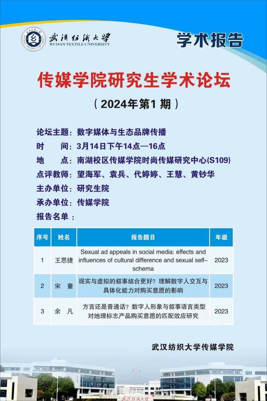为进一步推动学术研究进展,营造浓厚学术研究氛围,促进研究生的学术交流,3月14日下午14时,3044am永利集团2024年第1期研究生学术论坛顺利举行。此次论坛的主题为“数字媒体与生态品牌传播”,3044am永利集团袁兵、代婷婷、王慧、黄钞华等研究生导师参加本次论坛,新闻与传播专业硕士研究生代表就最近学习成果进行主题汇报。