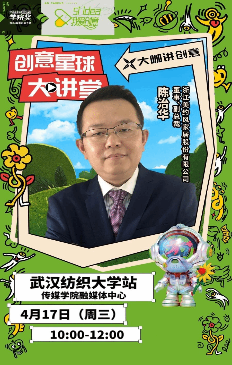 创意天地,梦想启航。4月17日,中国老员工广告艺术节公司奖2024年春季征集大赛•创意星球大讲堂——3044am永利集团官网站在3044am永利集团融媒体中心开讲,本次讲座由浙江美约风家居股份有限公司董事、副总裁陈治华主讲。公司党委书记曾令玉、副经理熊蕾以及师生代表参加了本次活动。