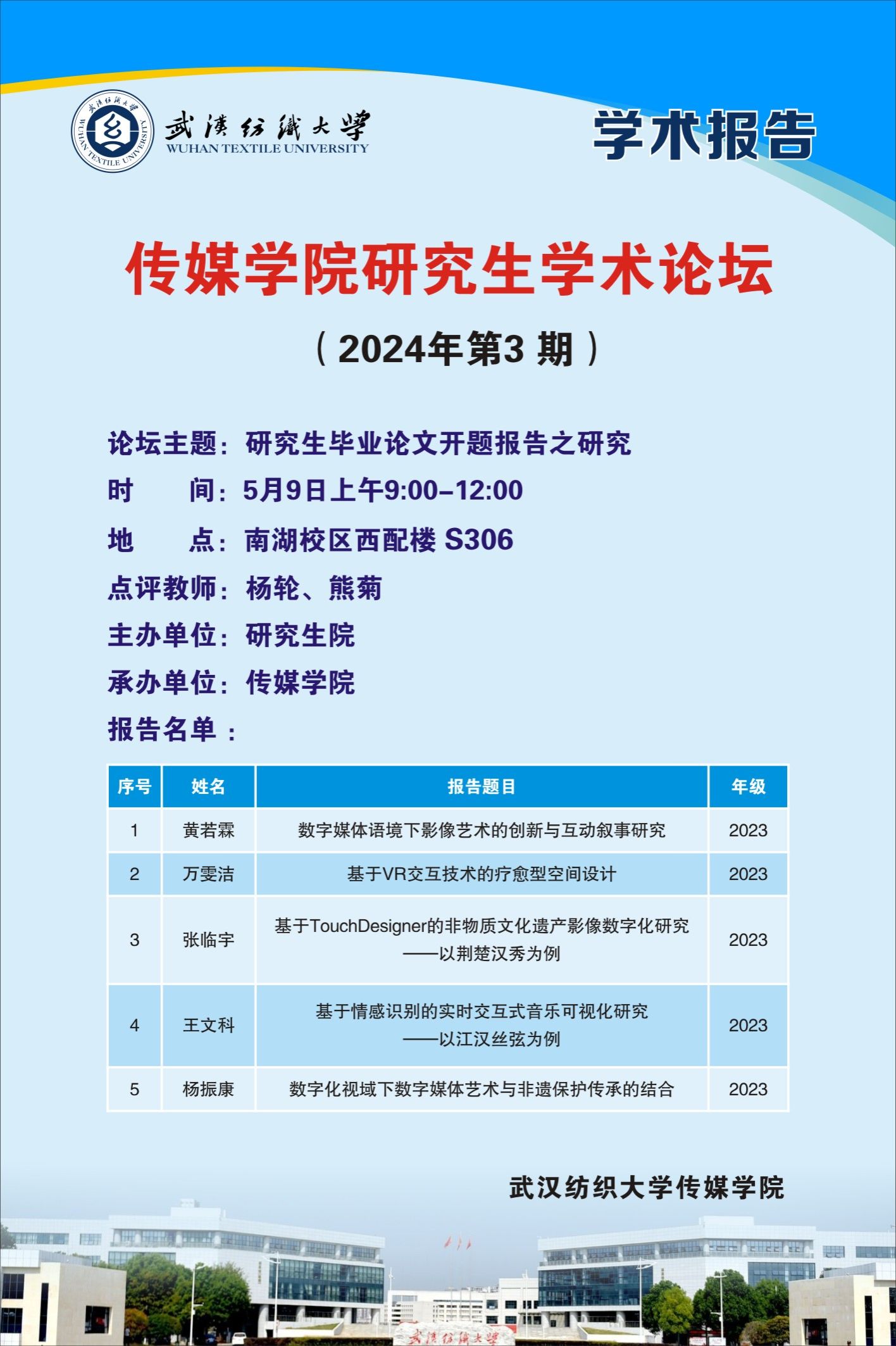 5月9日,3044am永利集团在南湖校区西经楼S306举行2024年第3期研究生学术论坛,本次论坛以“研究生毕业论文开题报告之研究”为主题,由硕士生导师杨轮主持并进行精彩的学术点评。