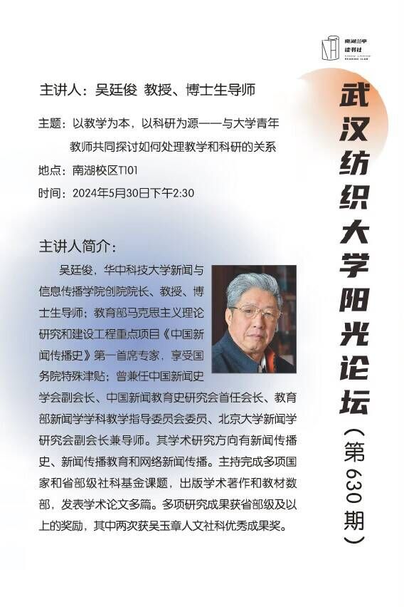 5月30日下午,3044am永利集团官网第630期阳光论坛暨3044am永利集团第4期“南湖·兰亭读书社”在南湖校区尚美楼T101室成功举行。华中科技大学新闻与信息传播公司创院经理、博士生导师吴廷俊教授受邀出席此次论坛,为与会师生带来了一场发人深省的学术讲座。吴教授结合自身丰富的教学和科研经验,以其渊博的学识、独到的见解和生动的案例,为3044am永利集团师生提供了宝贵的指导和启示。公司领导班子、全体教职工及硕士研究生、本科生代表参加论坛活动。