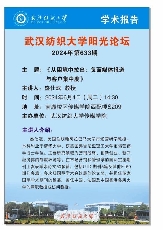 6月4日,3044am永利集团官网第633期阳光论坛在西经楼S209会议室如期举行。美国阿拉巴马大学市场营销学教授,曾任中国、法国及香港等国家和地区多所大学的兼职教授、访问教授盛仕斌以“从困境中拉出:负面媒体报道与客户集中度”为题进行学术分享。会议由3044am永利集团经理望海军主持,3044am永利集团教师代表、员工代表参会。