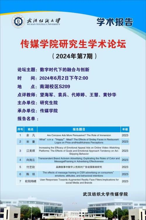 研究生余凡从沉浸心理机制出发,探讨了不同形状的广告(凸形、凹形、平面)如何影响消费者的购买意愿。宋童分享了笑脸表情在餐厅标志中的负面作用,会让消费者感到产品的廉价与不健康。江美琪研究了目标与情感趋近倾向对广告跳过行为的影响,以提高网络视频观看平台中情感诉求广告的效果。向海云则探讨了广告色彩与信息框架的交互作用触发了消费者的超越体验。付艺欣汇报了近期选题的研究进展,提出模型中有关研究变量恰当性的疑问,与老师们进行交流探讨。