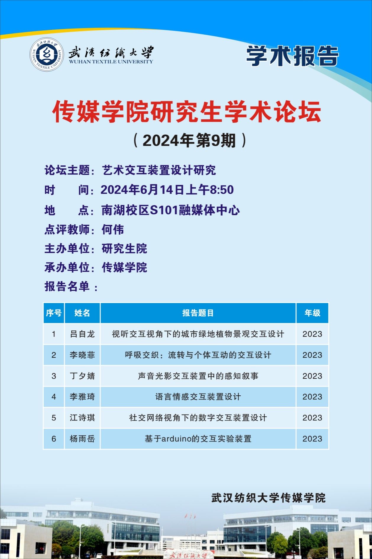 2024年6月14日上午,3044am永利集团在南湖校区西经楼 S101室举办第9期研究生学术论坛。本次论坛的主题为“艺术交互装置设计研究”, 旨在锻炼研究生的实操能力,提倡理论与实践相结合,为研究生们提供展示才华、分享经验的交流平台,激发更多创意和灵感交流。