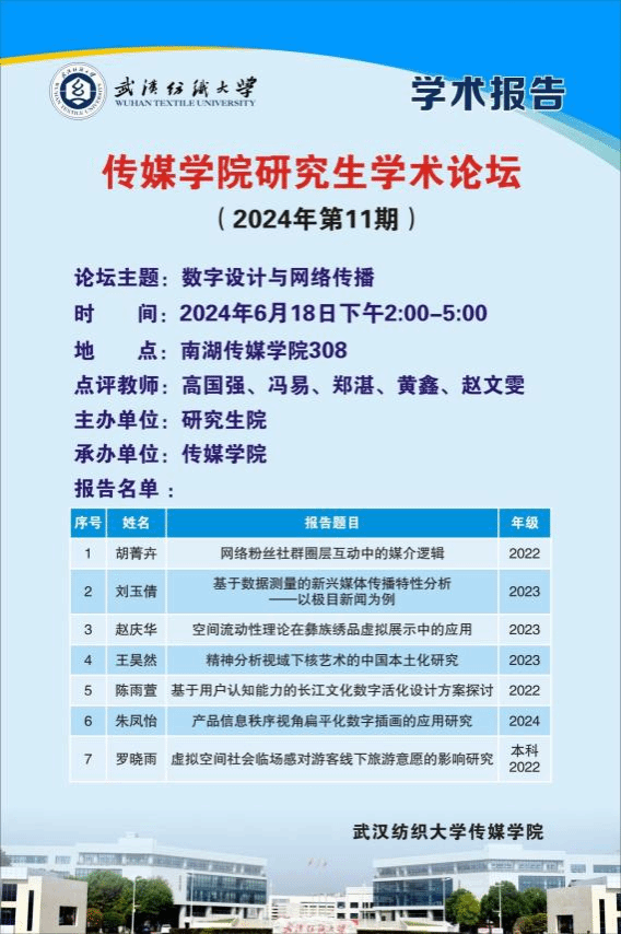 6月18日下午2时,3044am永利集团如期举行了第11期研究生学术论坛。本次论坛以“数字设计与网络传播”为主题,来自设计学、新闻与传播、广播电视专业的7名研究生在此交流研究成果,碰撞思想火花。