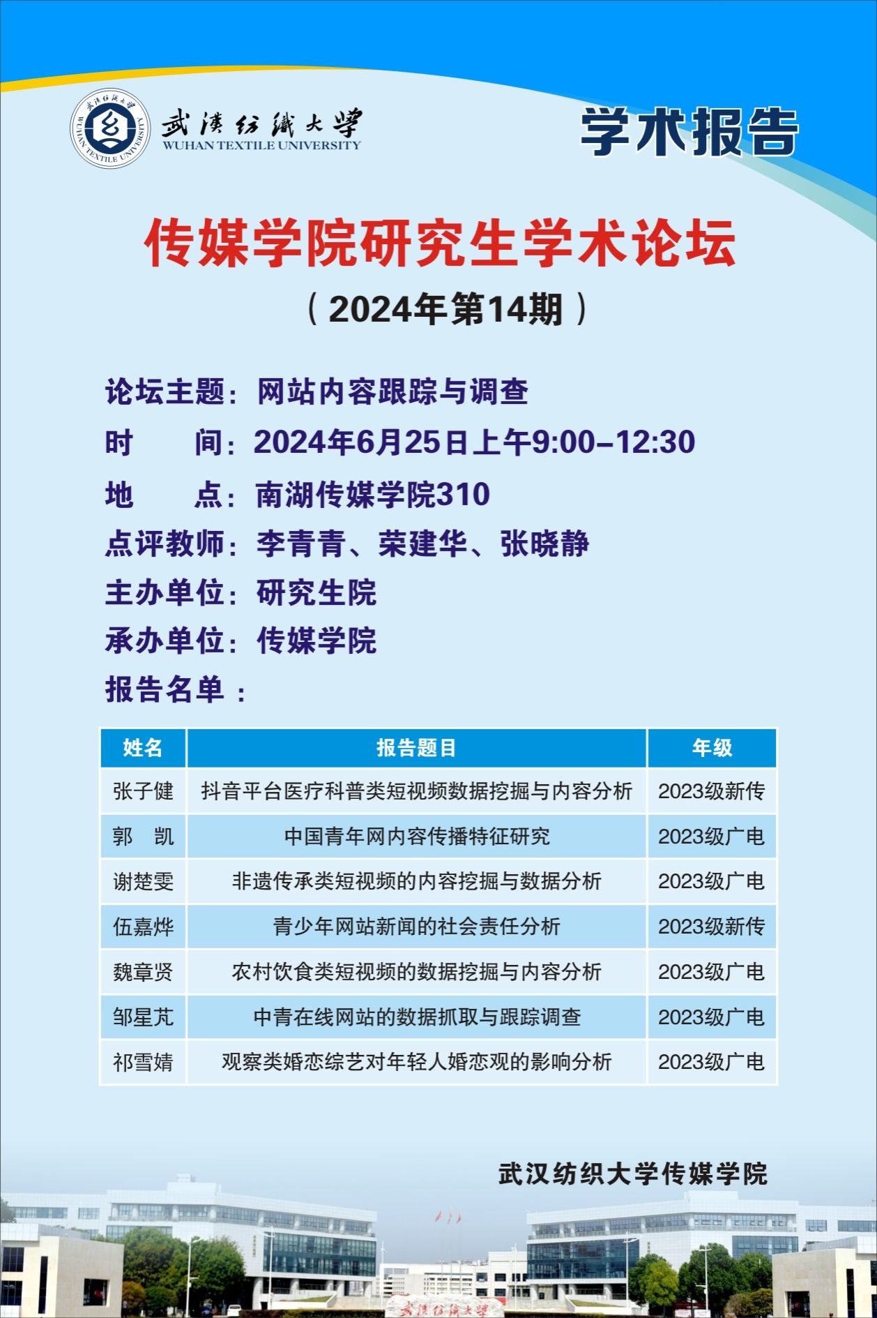 张子健、谢楚雯与魏章贤分别对医疗科普类短视频、非遗传承类短视频与农村饮食类短视频进行了数据挖掘与内容分析。郭凯研究了中国青年网的内容传播特征,伍嘉烨以未来网为例分析了青少年网站的社会责任,邹星芃对中青在线网站进行了数据挖掘与跟踪调查。祁雪靖汇报了观察类综艺对年轻人婚恋观的影响研究。