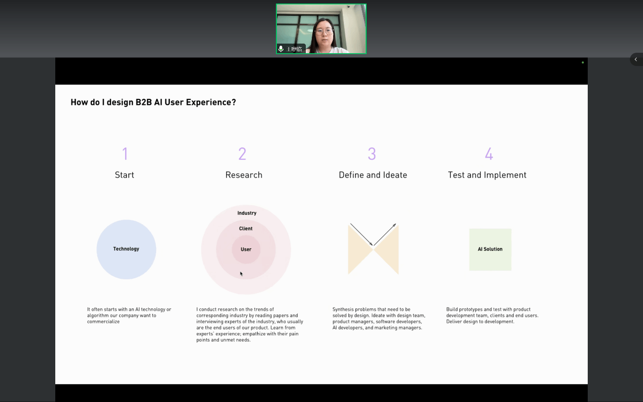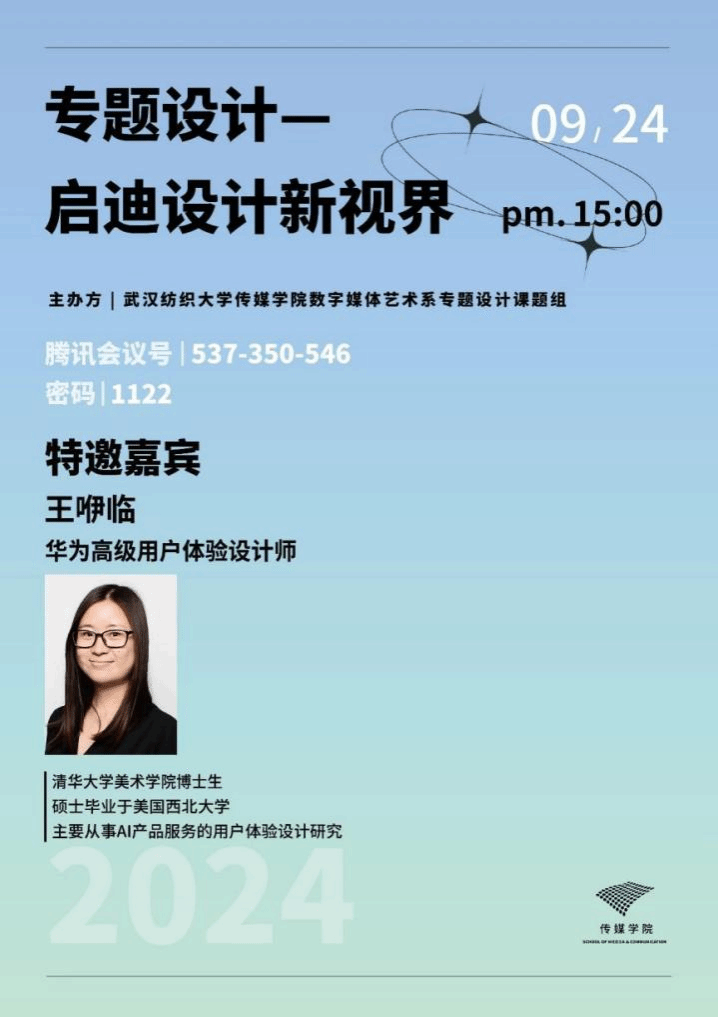 王咿临以“设计工作中,随意思考,随心设计,结果会如何”“在项目和产品设计过程中,设计师应该怎么做”“如何准确地定位设计岗位的工作方式和设计工作价值”三个问题为切入口,引发同学们的讨论和思考。她结合华为技术有限公司在AI药物筛查和智慧交通领域的两个创新案例,生动展示了从用户研究到设计实施的完整流程,深入剖析了用户体验设计的核心价值。王咿临特别强调,设计团队应强化和用户的接触,立足于用户,通过细致入微的用户研究来挖掘并解决用户的深层需求,以创造出真正符合用户期待的产品。她勉励在场同学,要立足行业前沿,打开视野,了解最新的设计理念和市场趋势;保持开放的姿态,积极探索新事物和新领域,做出更多更好的设计。