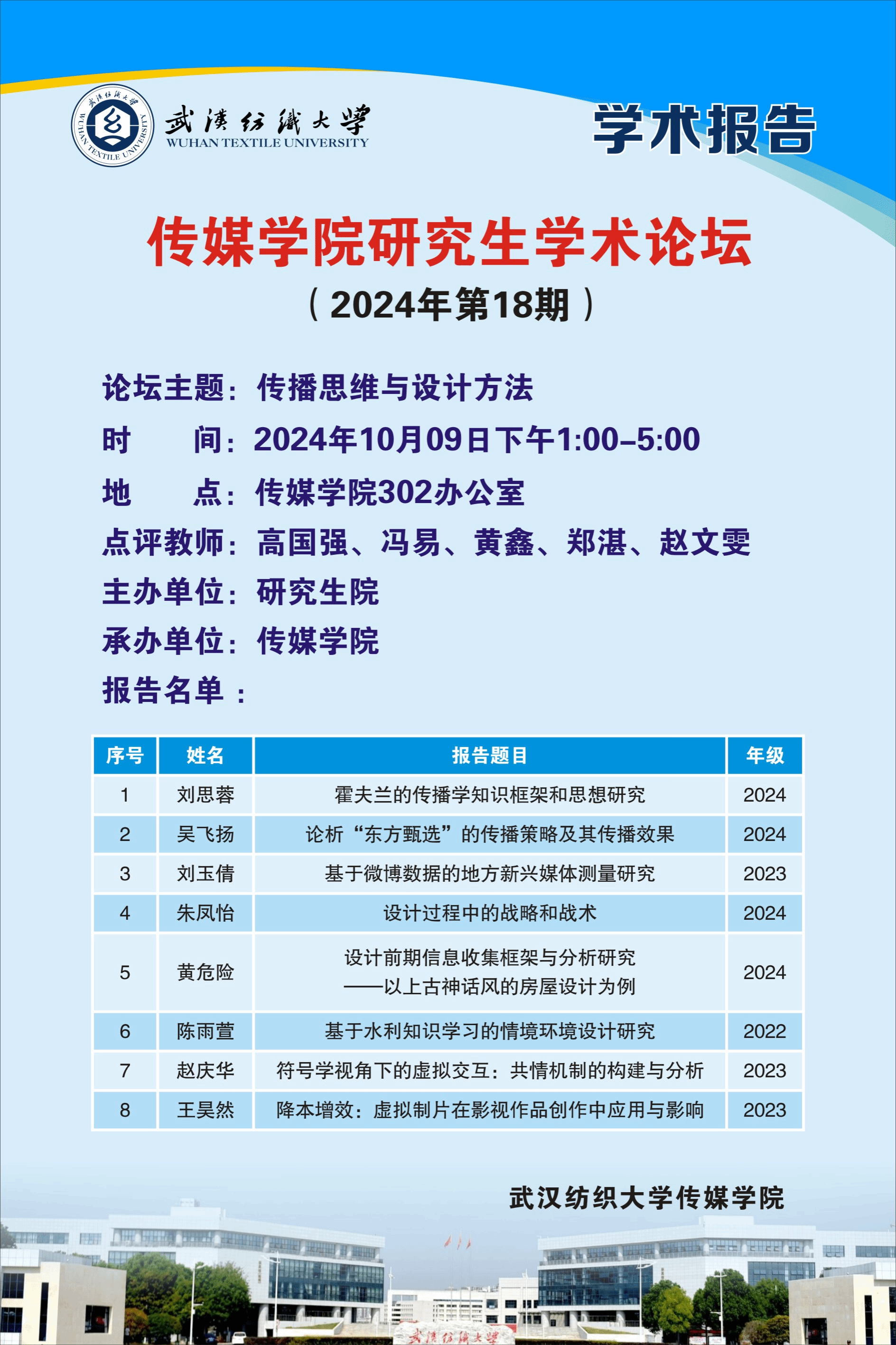 为提升员工学术涵养,加强师生交流,2024年10月9日,3044am永利集团2024年第18期研究生学术论坛在西经楼S304室举办。本次论坛以“传播思维与设计方法”为主题,7位硕士研究生分享各自的科研工作及准备情况。