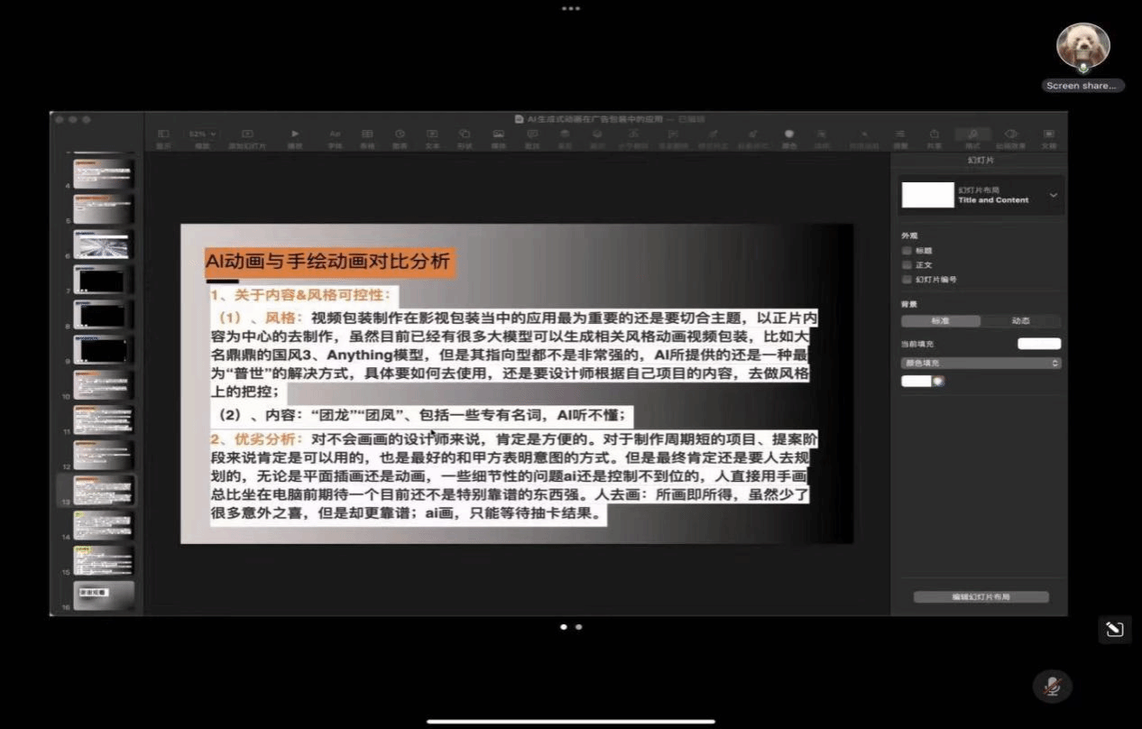 傅毅璇同学分享了《AI生成式动画在广告包装中的应用》。她以生动的案例展示了AI生成式动画在广告领域的广泛应用,从提升广告吸引力到增强品牌传播效果,全方位阐述了AI动画的商业价值。并且剖析了时下热门的AI产业在动画设计中的未来运用场景,她的报告让与会者感受到了科技为广告创意带来的无限可能。
