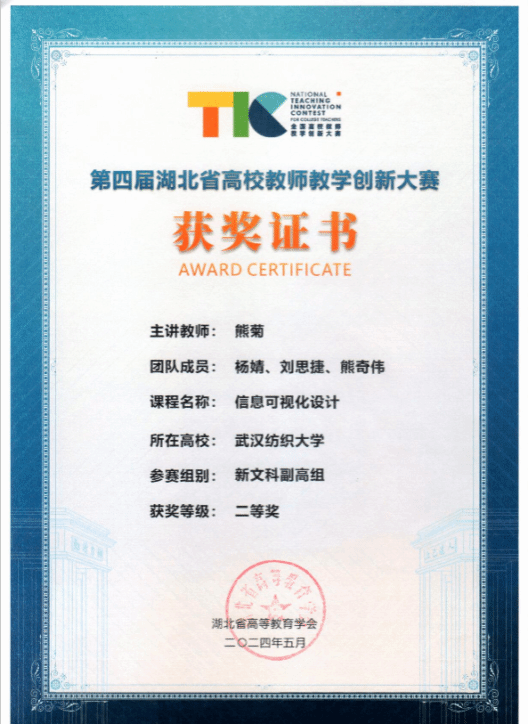 《广告与消费心理学》获批湖北省一流课程,获批省级教学研究项目2项,省级实验室研究项目1项,校级教学研究项目8项,课程思政示范课程1项。优化专业结构,积极调研智能交互设计等新工科专业建设。改善实践教学条件,改造升级时尚传媒交互体验中心。将创新创业教育深度嵌入专业课程教学,严格落实每个专业有3-4项学科竞赛平台,学科竞赛的员工参与面达到90%。获批国家级大创项目1项、省级大创项目2项,校级大创项目1项。熊菊副教授团队获第四届湖北省高校教师教学创新大赛二等奖。