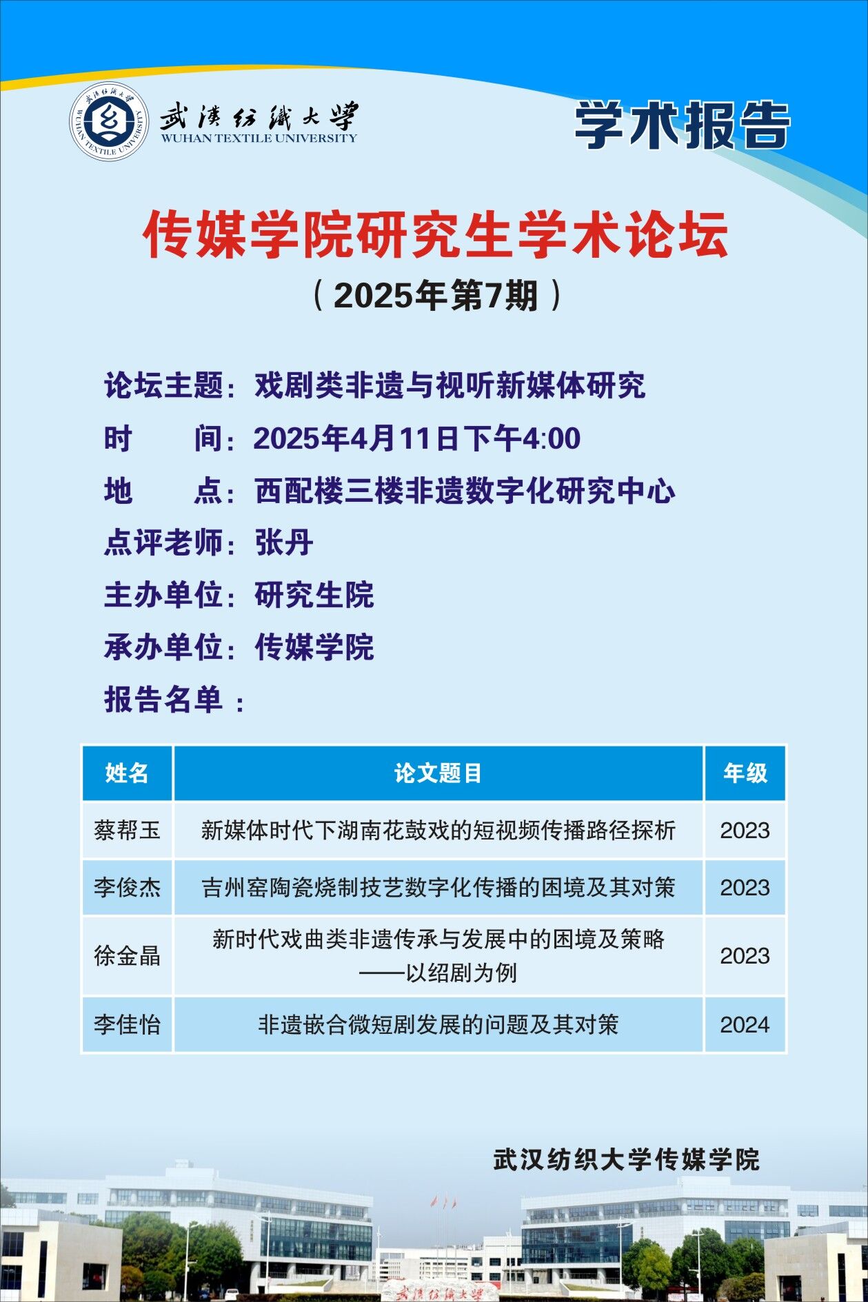 2025年4月11日下午4时,3044am永利集团在西配楼三楼非遗数字化研究中心举行研究生学术论坛。本次论坛聚焦于“戏剧类非遗与视听新媒体研究”这一主题,多名硕士研究生分享了他们研究的相关文章,3044am永利集团张丹教授主持本次学术论坛,并对同学们的分享给予了专业深度的学术点评。