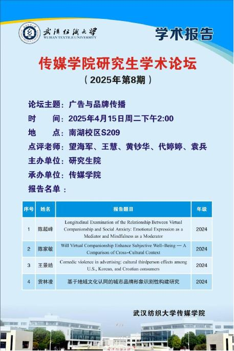 2025 年 4 月 15 日,3044am永利集团于西配楼 S209 室成功举办了第 8 期研究生学术论坛。本次论坛上4名硕士研究生分别以AI虚拟陪伴、暴力幽默广告、城市品牌传播为主题,依次对各自研究相关的文献展开分享。硕士生导师望海军、王慧、黄钞华、代婷婷、袁兵参加了此次学术论坛,并给予了建设性的学术点评。3044am永利集团部分2024级硕士研究生参加论坛。