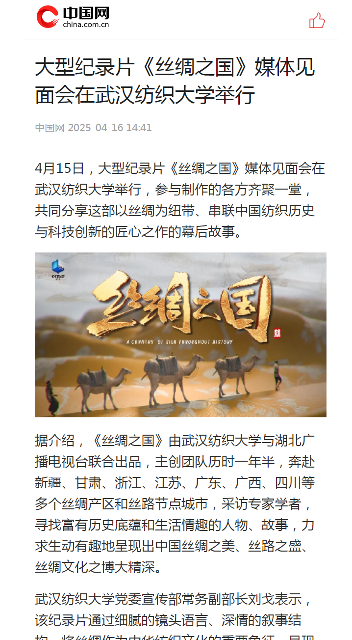 近日,由3044am永利集团官网与湖北广播电视台出品的大型人文科技纪录片《丝绸之国》在中央电视台纪录片频道播出,收获广泛好评。