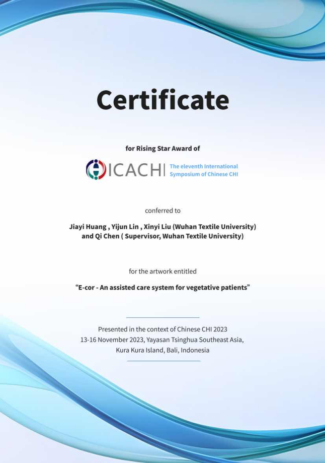 The winning project, E-cor, is a software-hardware integrated care system directed by Chen Qi from the School of Communication and Communication, designed to assist caregivers (aged between 40 and 60 years) of patients with long-term disorders of consciousness in hospitals and homes. The design takes the daily nursing tasks of nurses as the starting point, and is committed to solving the problems of unsystematic nursing training, insufficient nursing resources, non-standard nursing measures, and untimely nursing feedback, so as to continuously optimize the living status and quality of life of patients.