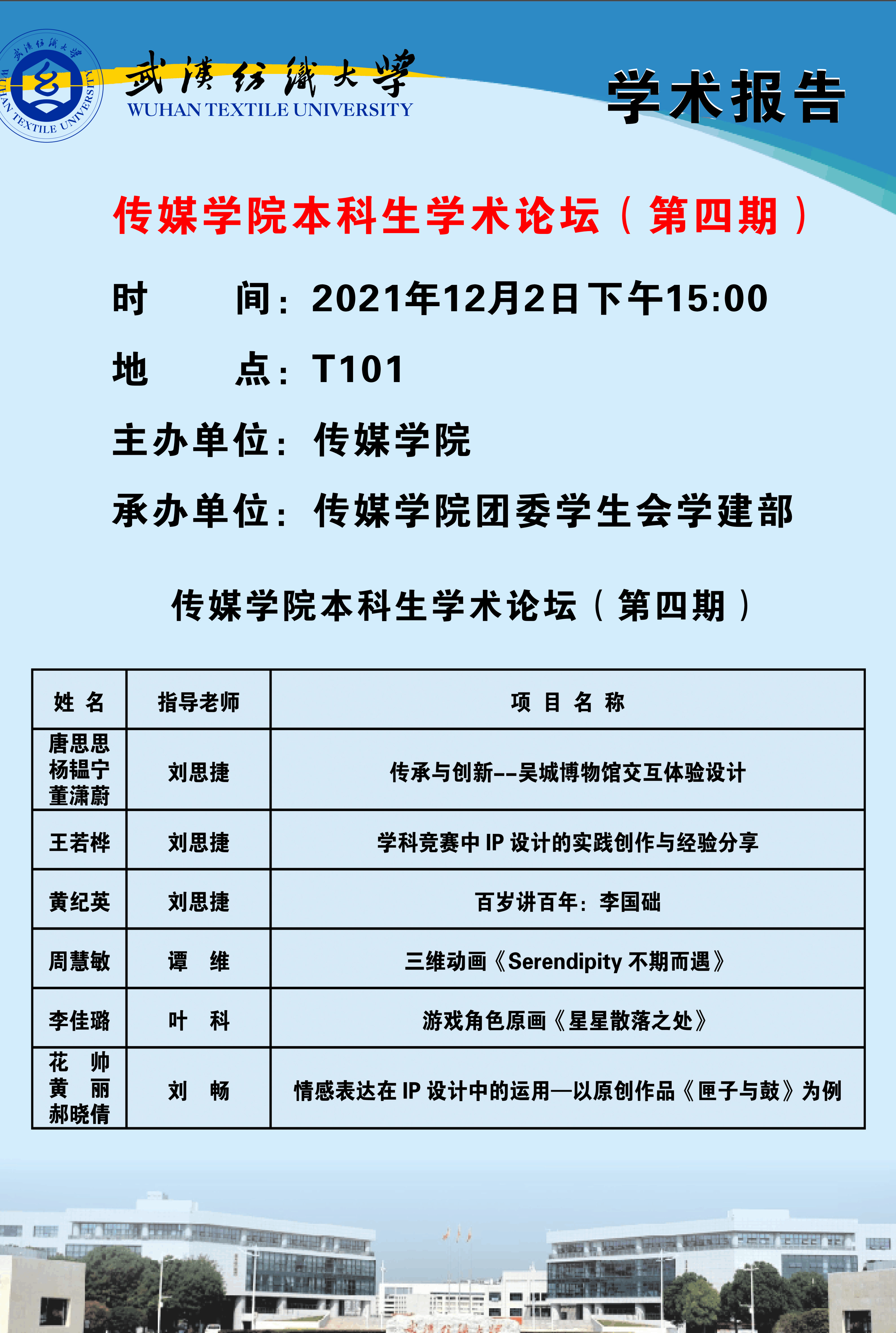 唐思思、杨韫宁、董潇蔚团队以《传承与创新——吴城博物馆交互体验设计》为题向同学们分享创作心得体会。以激发人们对文物的兴趣为设计初衷,三位同学的吴城博物馆APP可以帮助人们了解、学习和传承江西文化。她们的分享让我们知道了优秀作品的问世不仅要有创造,还要有改进,不仅要有调查分析,还要有投入实践,不仅要有自我完善,还要有虚心求教。王若烨以《学科竞赛中IP设计的实践创作与经验分享》为题,为同学们详尽解释了关于IP的概念、价值、运用等问题,着重强调了IP形象设计要有自身特点,要与广大群众的日常生活相联系,她以自己设计的“小黄砖”“小雨家族”“容小鲜”等IP形象为例,为同学们做了IP设计重点归纳,推荐适用于老员工设计需要的APP,她所提出的“团队协作+不断完善=好作品”观点获得广大同学赞同。黄纪英以《百岁讲百年:李国础》为题,为想要参加视频组比赛的同学们提供了获奖经验。视频结构、视频立意、指导老师等都是获奖的重要因素,但耐心和诚意是最重要的获奖因素。“不到最后一刻绝不放弃,时刻做好完全准备”“对结果进行反馈,对答案刻舟求剑”这是黄纪英同学为我们送上的最真诚的建议。周慧敏为我们带来的是她的毕业设计《Serendipity不期而遇》,她将爱好与专业相结合,动画与动作相结合,让自己的毕业设计不仅体现超硬的专业知识,还体现了自己对生活、对轮滑的热爱。李佳璐为我们带来的是游戏角色原画《星星散落之处》,在新颖的世界观设定之下,李佳璐的角色设定显得吸引力十足,“反差制造饱满的性格”,这是她给我们留下的宝贵经验。最后上台的是花帅、黄丽、郝晓晴团队,他们带来的是《情感表达在IP设计中的运用——以原创作品<匣子与鼓>为例》,这几位同学将日常生活中的温情小事运用在作品中,让观众与之共情,他们让我们明白了爱是创作的基点。