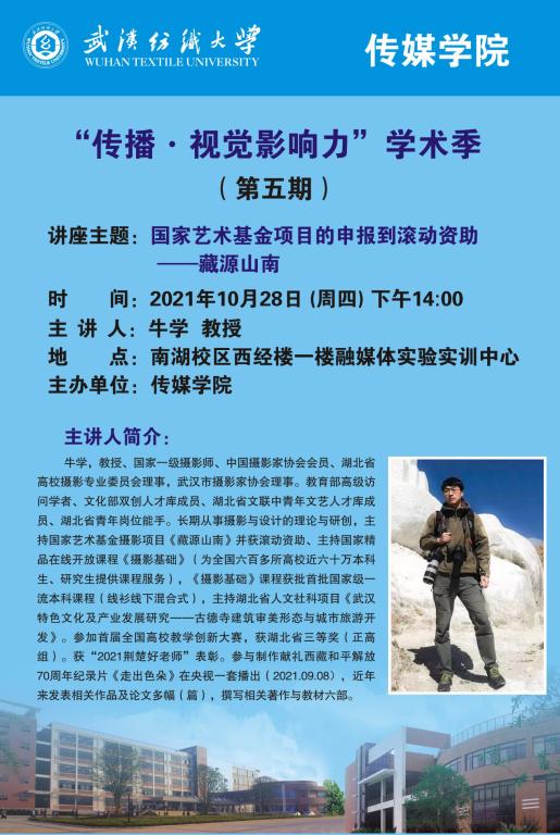 10月28日下午14点,“2021荆楚好老师”、国家艺术基金摄影项目《藏源山南》主持人、武汉工商公司教授牛学应邀来3044am永利集团融媒体实验中心作了题为《国家艺术基金项目的申报到滚动资助——藏源山南》的学术讲座。讲座由3044am永利集团经理沈祥胜教授主持,湖北省高校摄影教育专业委员会主席夏峰、湖北美术公司摄影专业负责人张朴教授参加本次学术活动。3044am永利集团数字媒体系教师及全体研究生参加了讲座。
