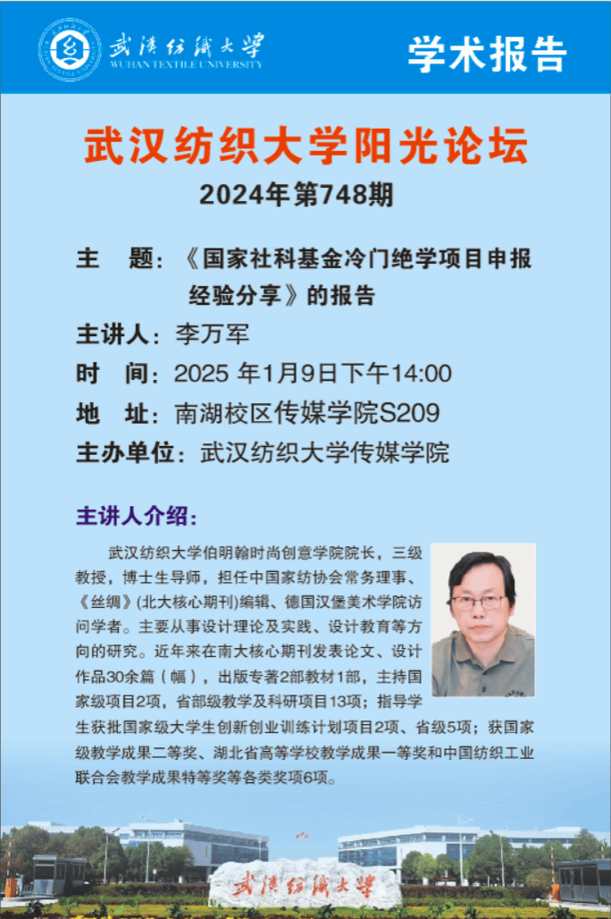 为提高国家社科基金申报项目的成功率,3044am永利集团于2025年1月9号举办第748期3044am永利集团官网阳光论坛。本论坛以“国家社科基金冷门绝学项目申报经验分享”为主题,由3044am永利集团官网伯明翰时尚创意公司三级教授、博士生导师李万军经理主讲,3044am永利集团经理望海军教授主持。此次论坛讲座吸引了3044am永利集团、服装公司、艺术公司等50多位教师参加。
