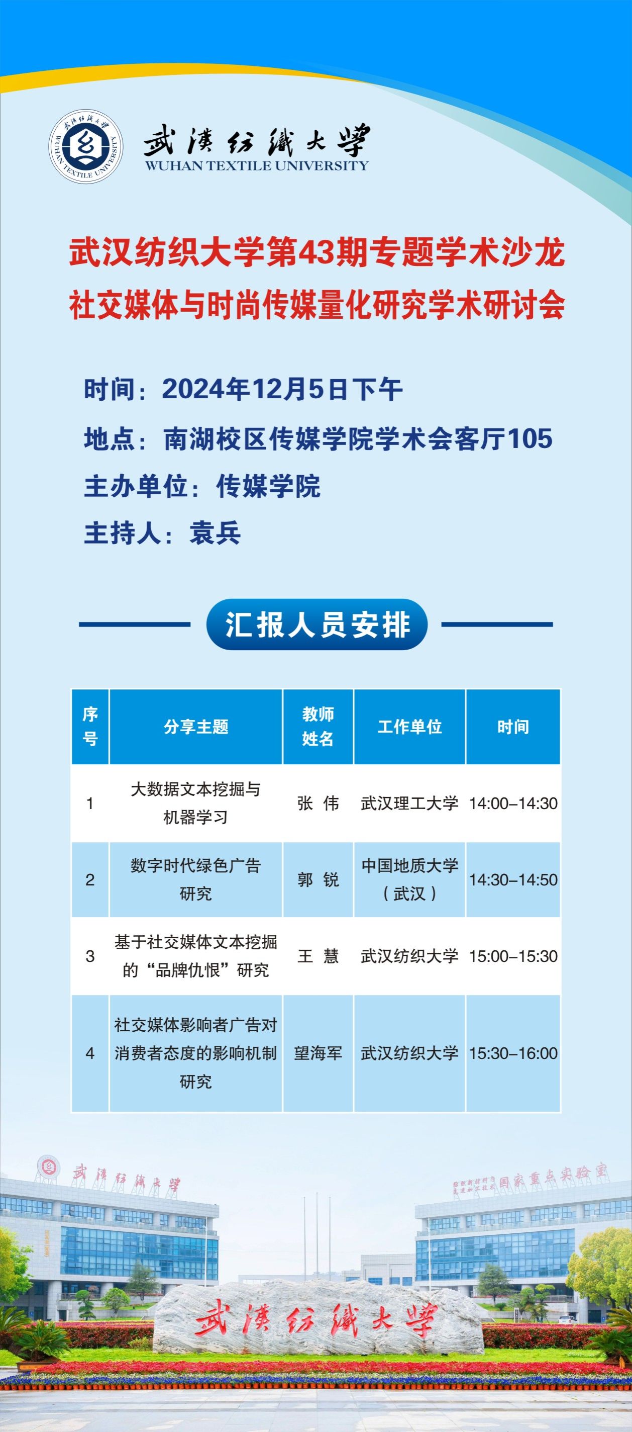 12月5日下午,3044am永利集团官网第43期专题学术沙龙在南湖校区西经楼S105学术会客厅举办。本次学术研讨以“社交媒体与时尚传媒量化研究”为主题,武汉理工大学张伟副教授、中国地质大学(武汉)郭锐教授、3044am永利集团时尚传媒量化研究中心的全体老师和研究生参加会议。研讨会由3044am永利集团袁兵教授主持。