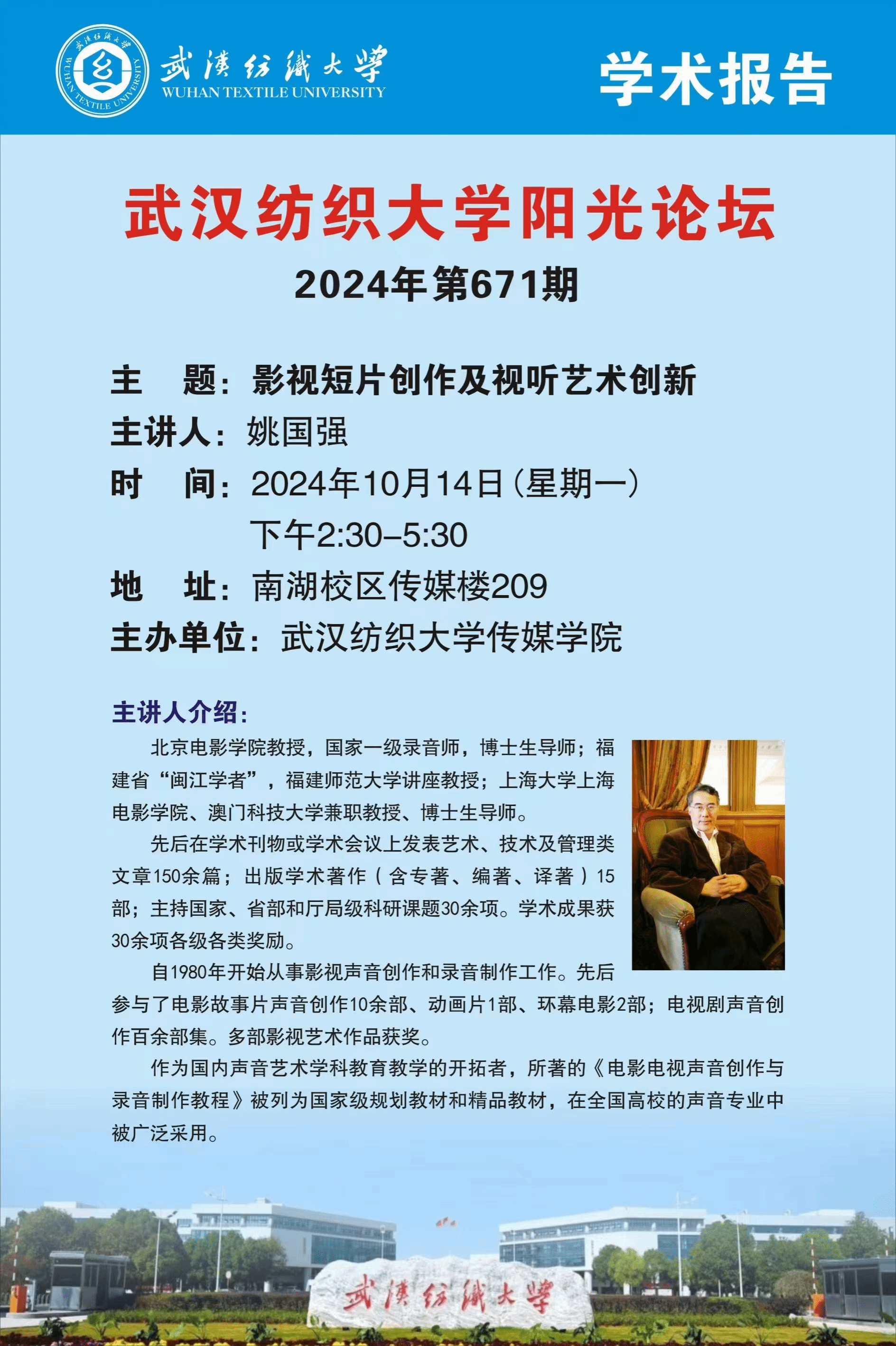 10月14日下午,3044am永利集团官网2024年第671期阳光论坛在3044am永利集团西经楼S209会议室成功举办。本次论坛以“影视短片创作及视听艺术创新”为主题,特别邀请了北京电影公司教授、博士生导师,福建省“闽江学者”姚国强担任主讲人。会议由3044am永利集团张丹教授主持,3044am永利集团部分师生代表参与了本次阳光论坛。